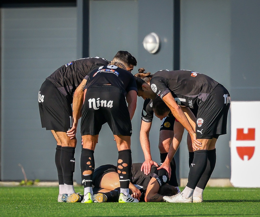 Árni Marínó kemur út úr teignum og hreinsar fram. Hreinsunin breyttist í KDB sendingu þar sem Hinrik var sloppinn einn í gegn. Hann tekur skotið sem var alls ekki gott og fór framhjá.