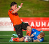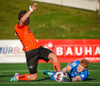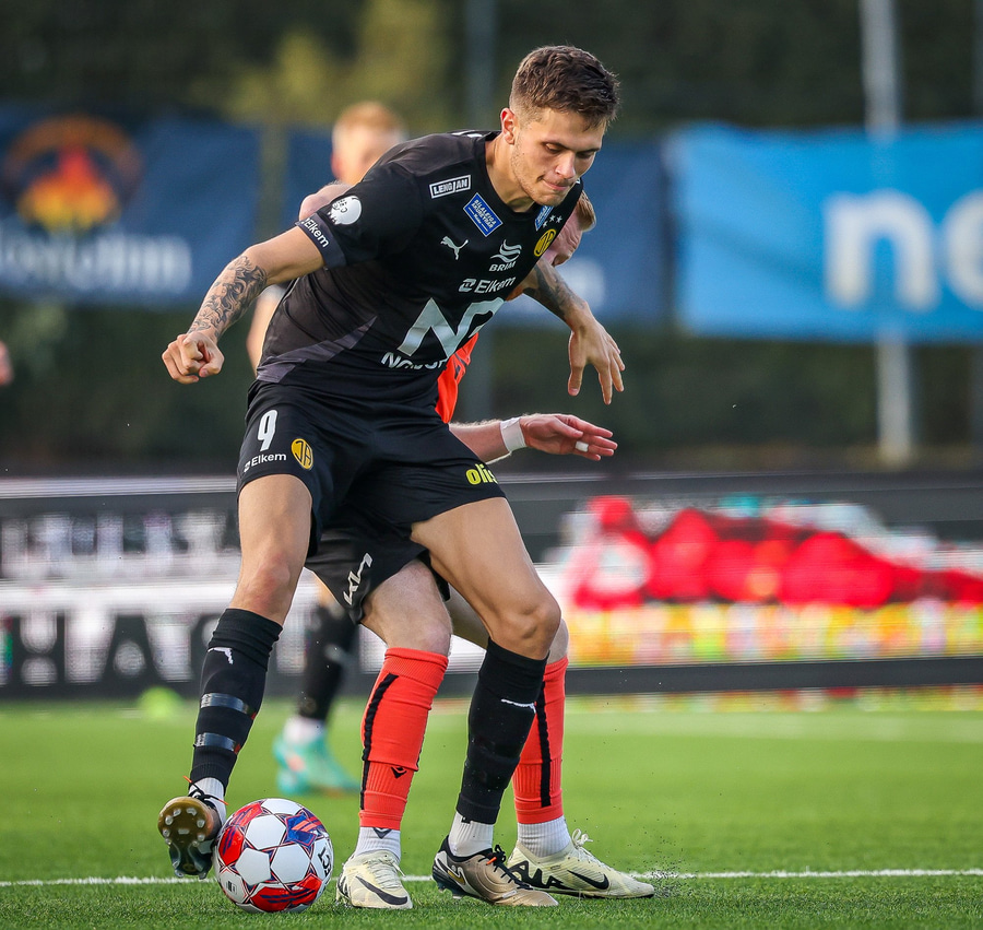 Fer of seint í Oliver eftir að Oliver náði boltanum fyrst og fær gult.