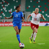 Hildur brýtur af sér og er kannski eilítið heppin að fá ekki gult spjald. Aukaspyrna á vallarhelmingi Póllands.