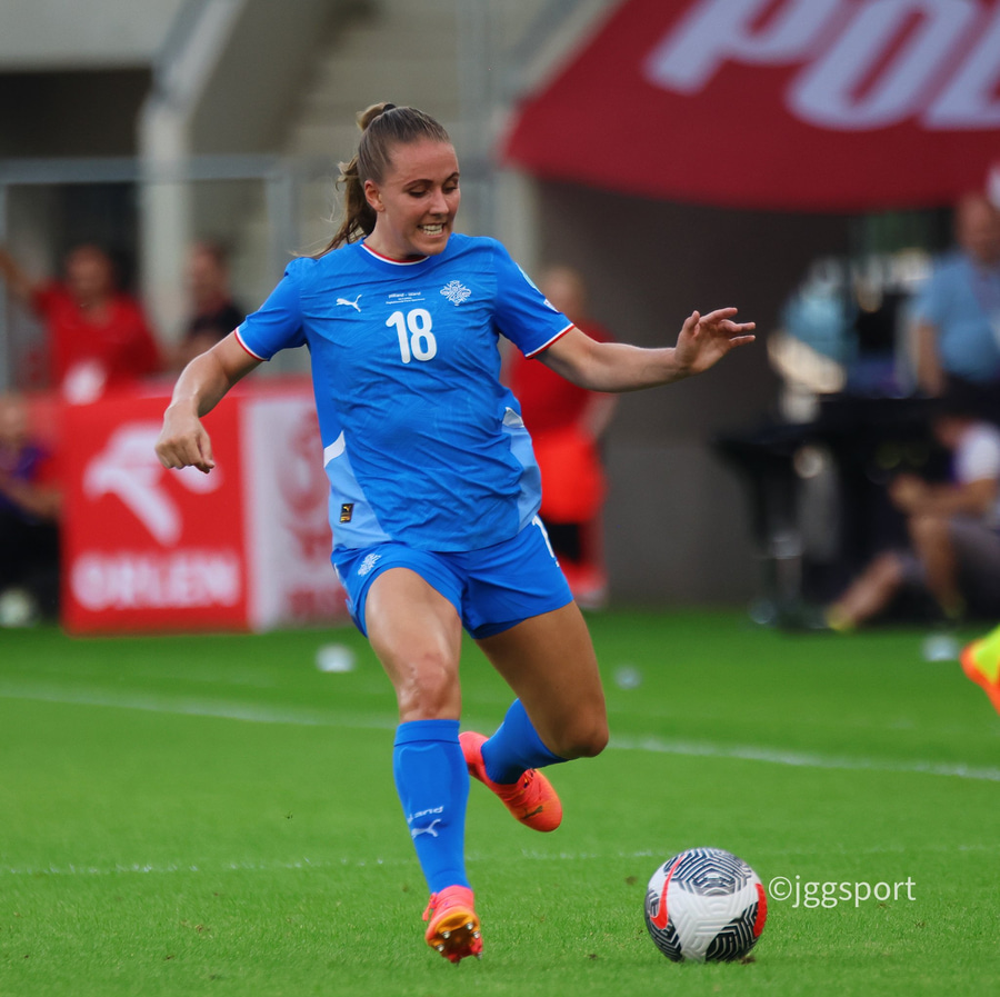 Völlurinn virkar frekar laus í sér. Sveindís rann í grasinu þegar hún fór í pressuna áður en Pólland fékk þetta tækifæri.