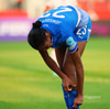 Martyna Wiankowska er að fara af velli, hún er studd af velli, sýnilega meidd.