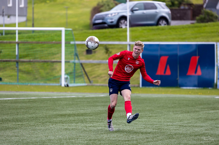 Eiður Orri kemur með góðan bolta inn á teig sem fellur fyrir Patrek Aron inni á teignum sem á ágætis skot í hliðarnetið.