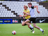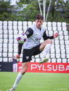 Sparkar boltanum burt og fær gult fyrir leiktöf.