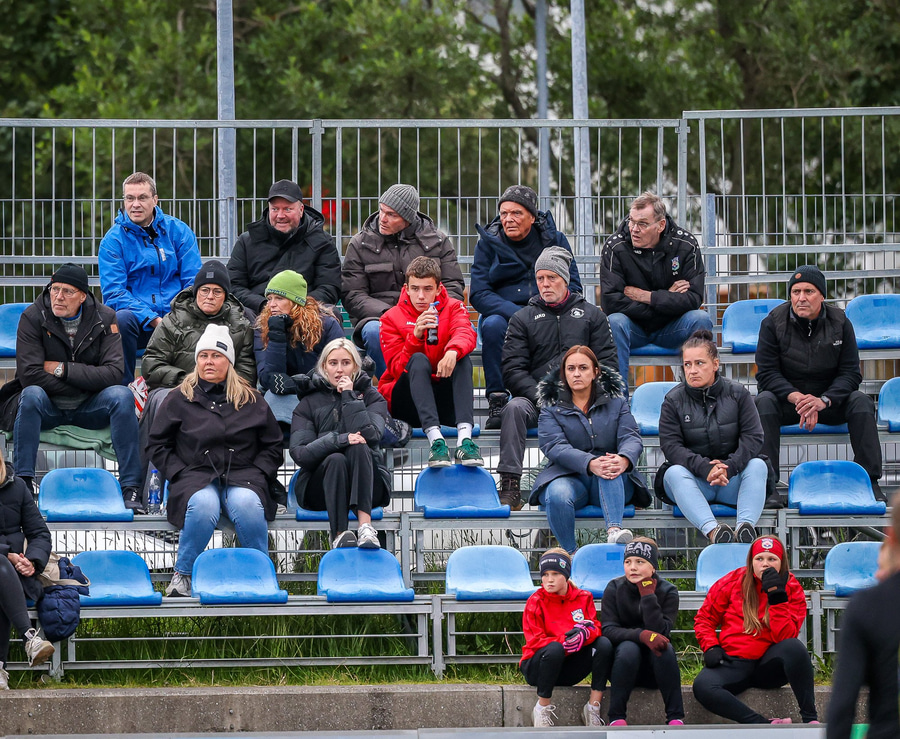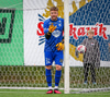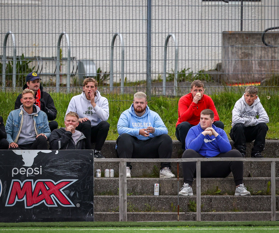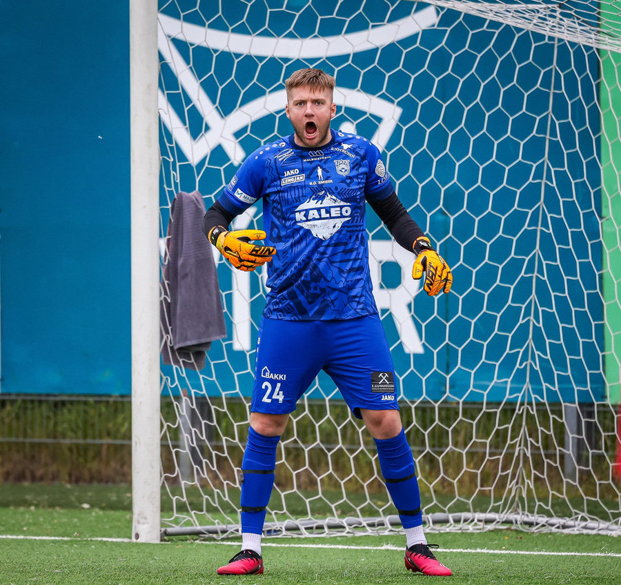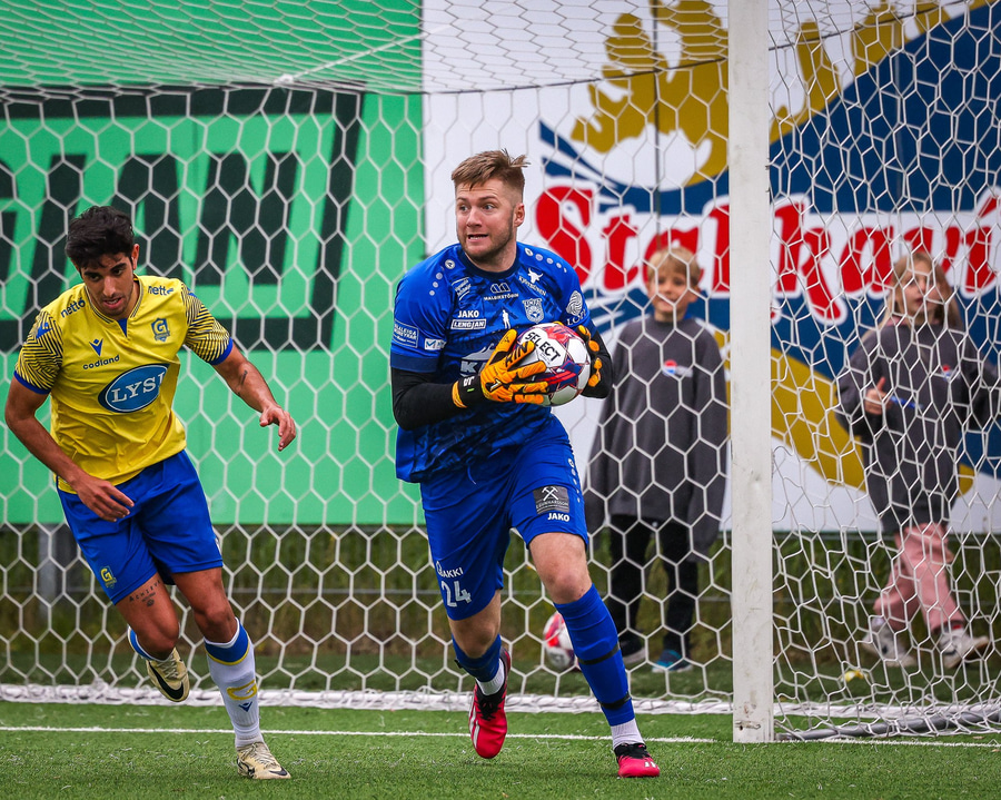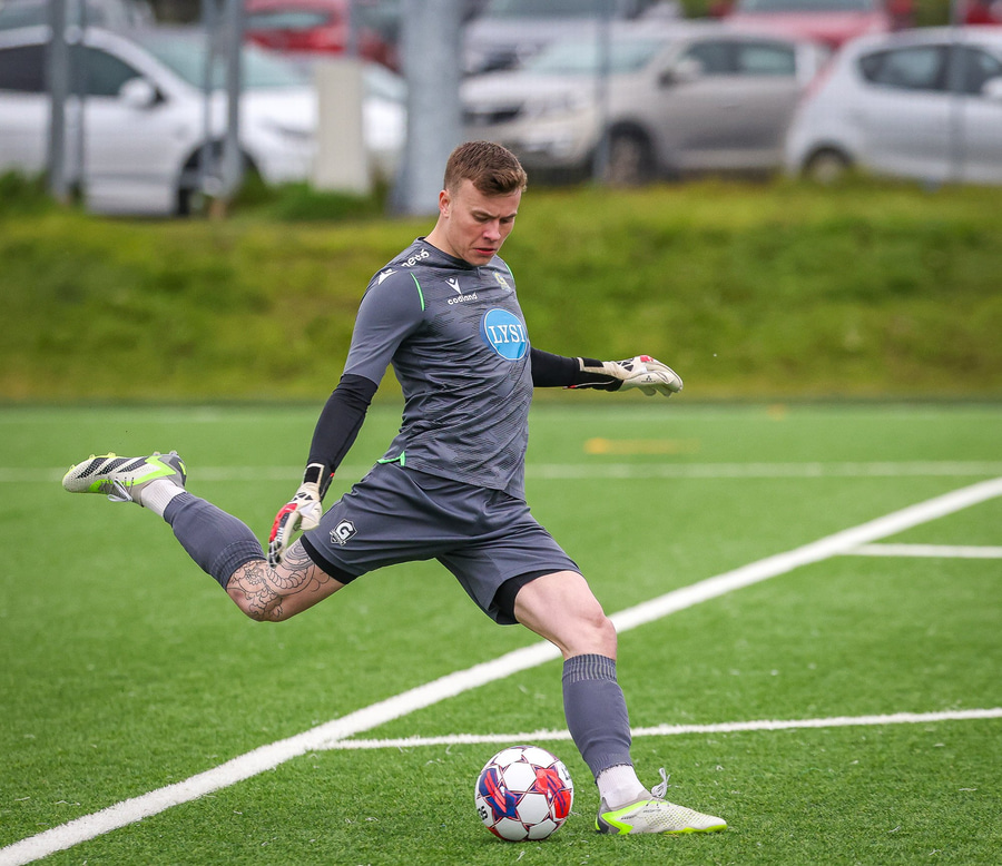 Aron Dagur hreinlega veiðir hann í sitt horn og ver glæslilega í stöng og út. Frákastið berst á Hrannar að mér sýnist sem hamrar boltann yfir markið.