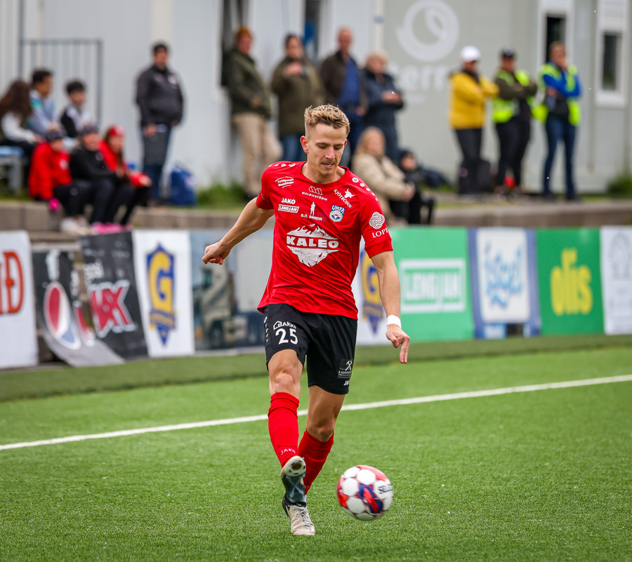 Sævar Atli réttur maður á réttum stað í teignum og skilar boltanum í netið úr dauðafæri.