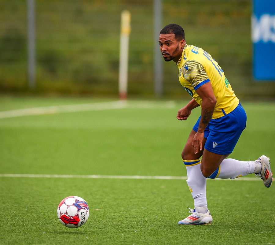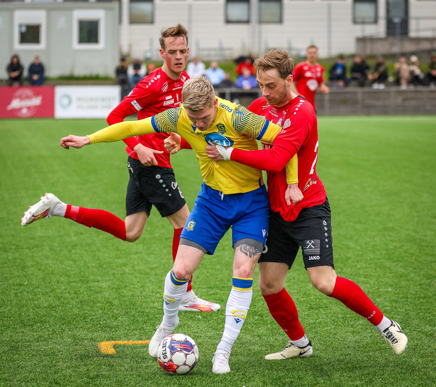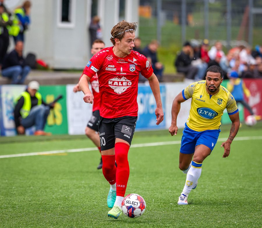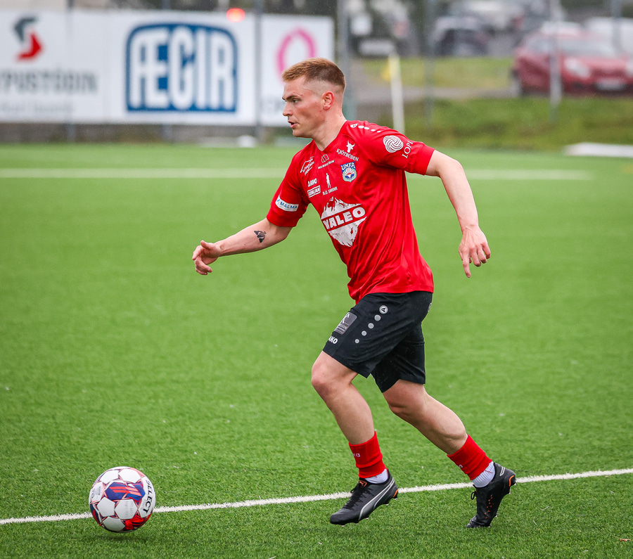 Elmar keyrir inn á teiginn og köttar inn, varnarmaður situr eftir setur fótinn fyrir og Elmar fellur.