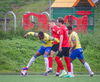 Aron með boltann yfir á fjær þar sem Sigurpáll Melberg rís hæst en nær ekki að stýra boltanum a markið.