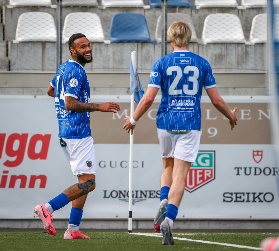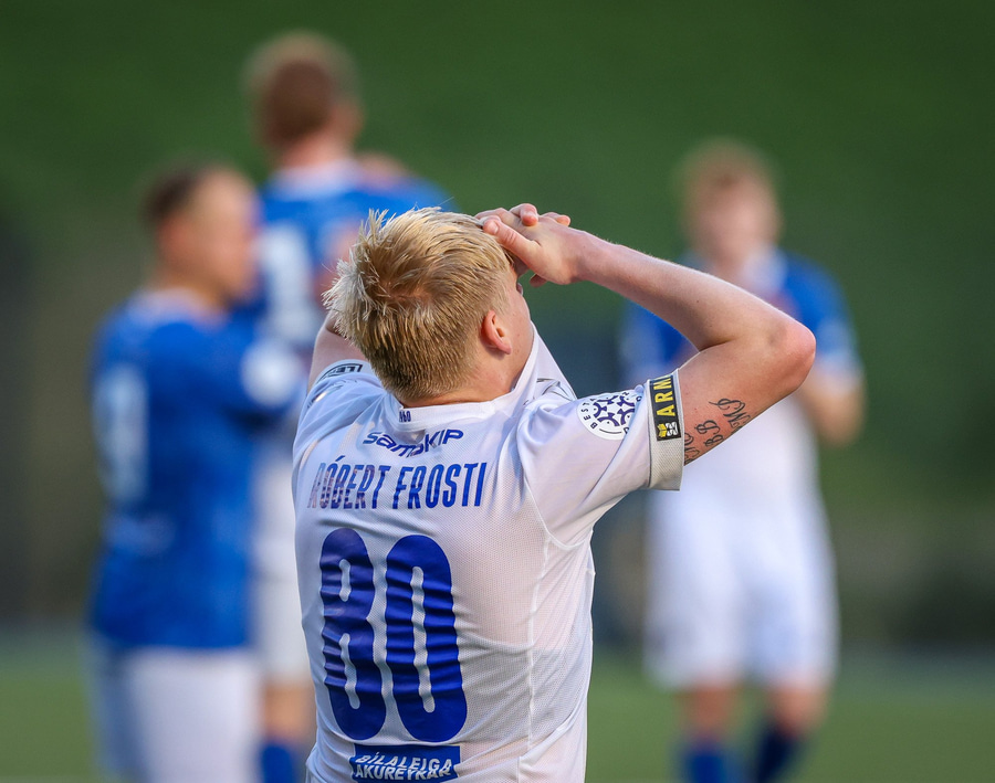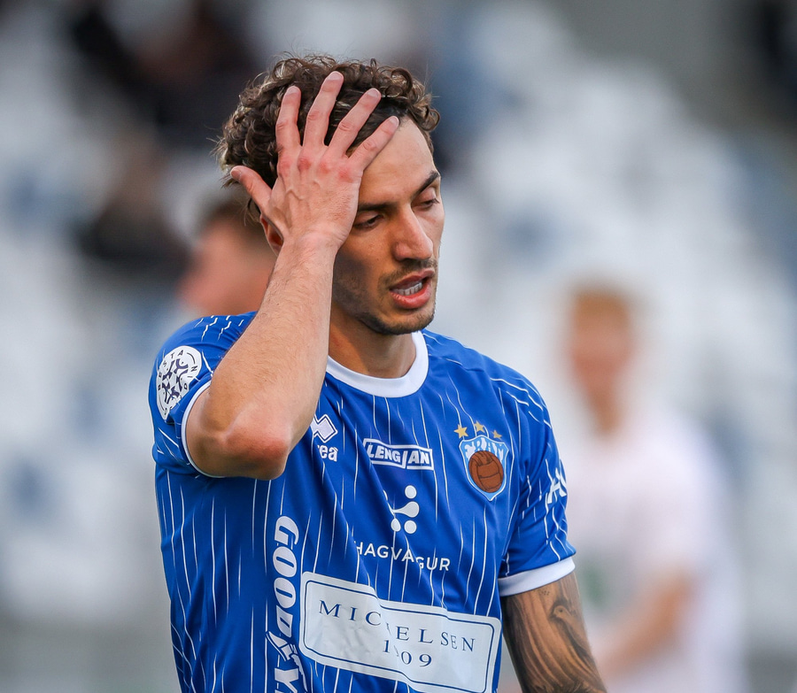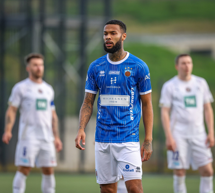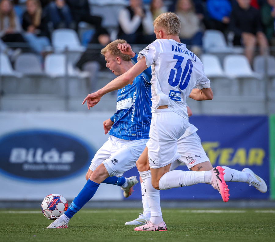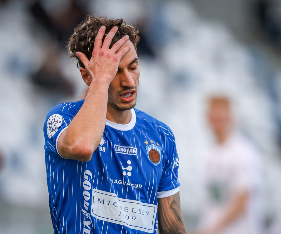 Árni Snær ískaldur og missir boltann til Djenairo sem nær ekki fullu valdi á knettinum. Gummi Kri mætir og bjargar þessu og Djenairo brýtur á honum.