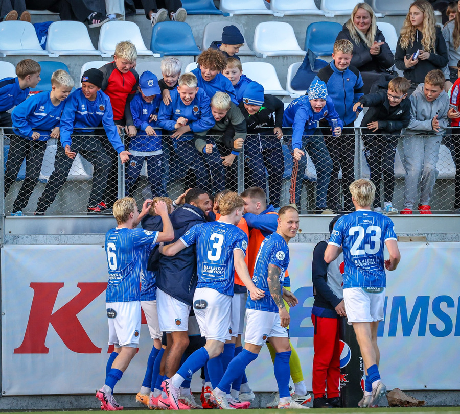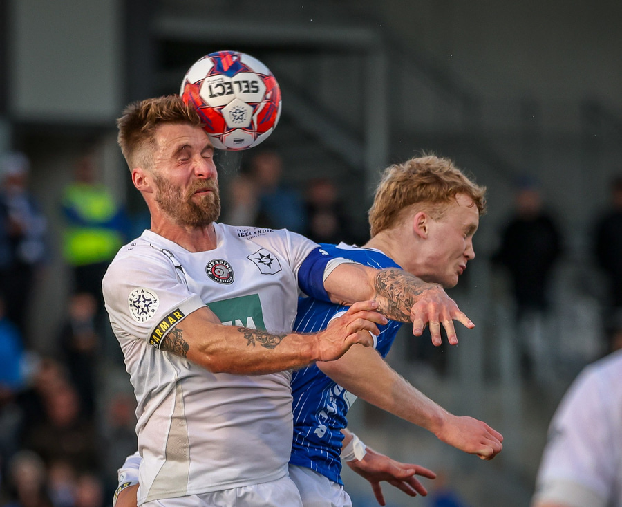 Heiðar Ægisson kemur með fastan bolta fyrir og Adolf mætir á ferðinni og reynir að stýra knettinum í hornið en víðsfjarri.