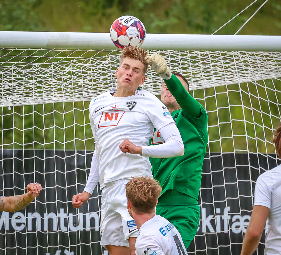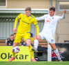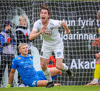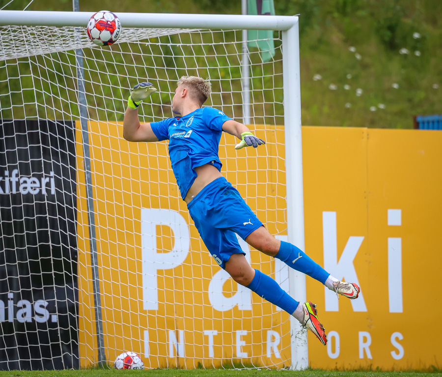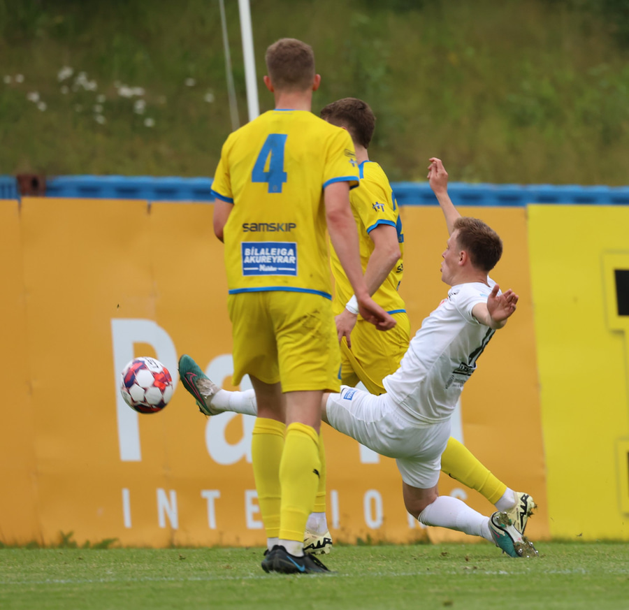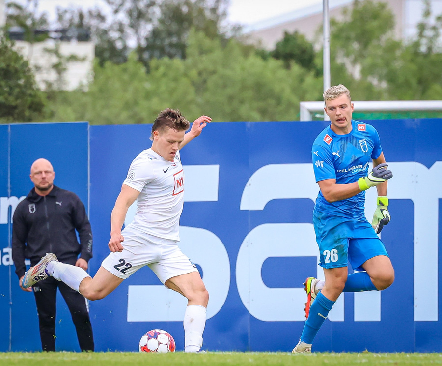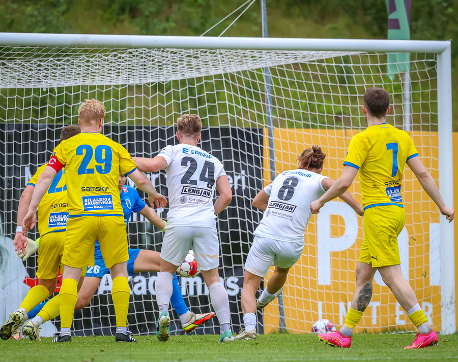 Oliver fær hættulega sendingu, Halldór Snær fer í skógarferð úr markinu og Oliver kemst framhjá honum. Á ekki í erfiðleikum með að skora í autt markið.