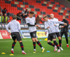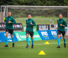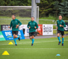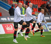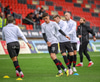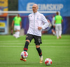Þeir eru ellefu útileikmennirnir sem eru að hita upp með byrjunarliði Víkinga. Spurning hvort einhver sé tæpur.