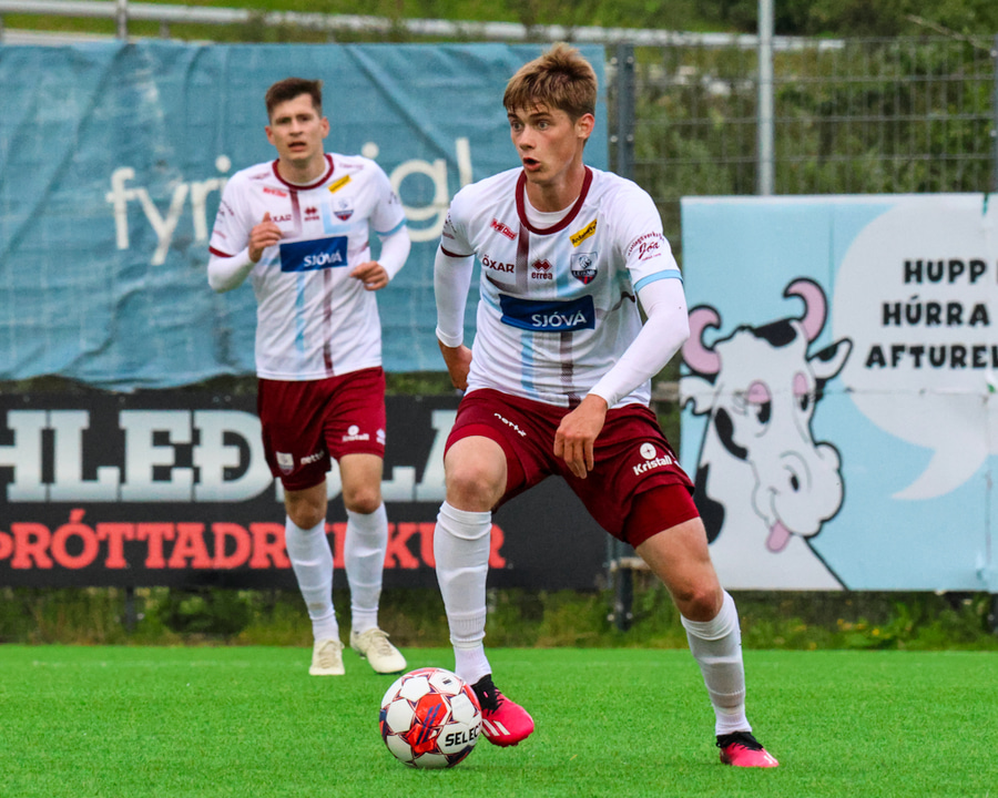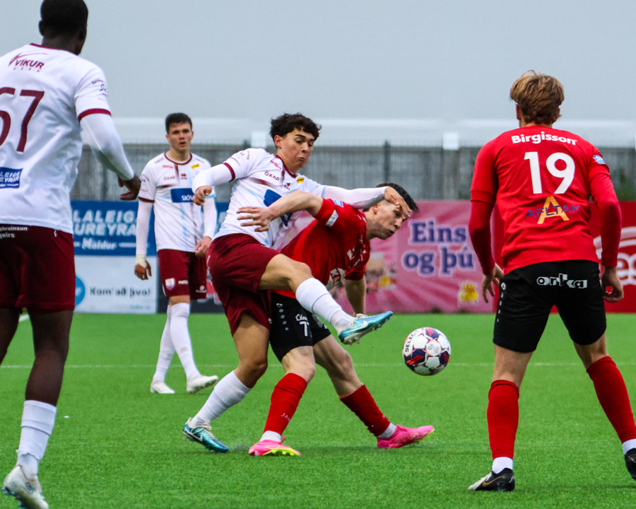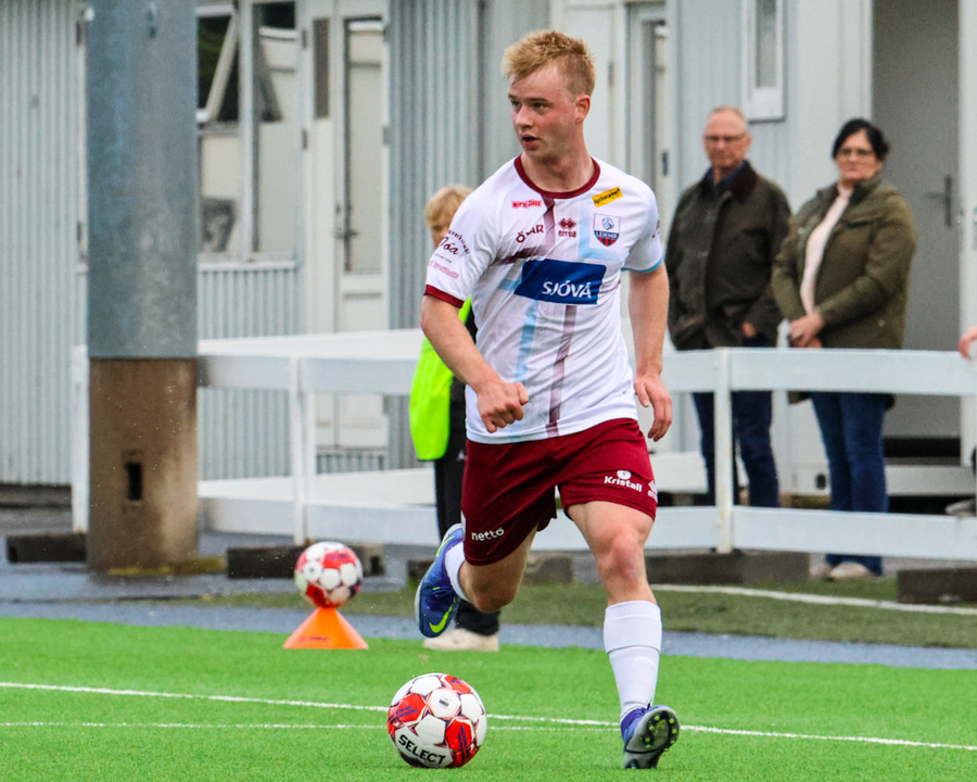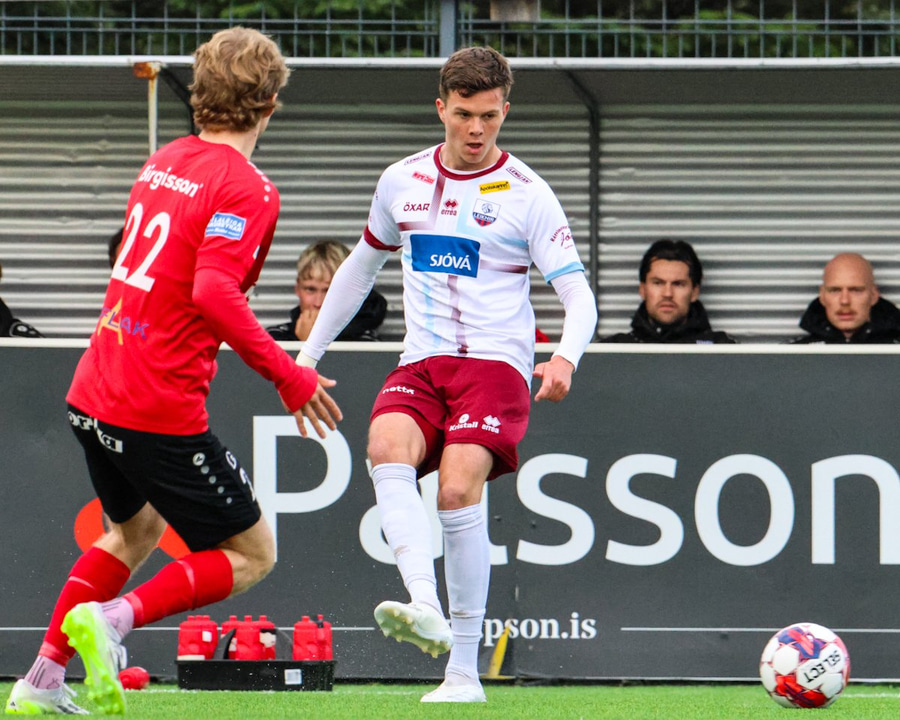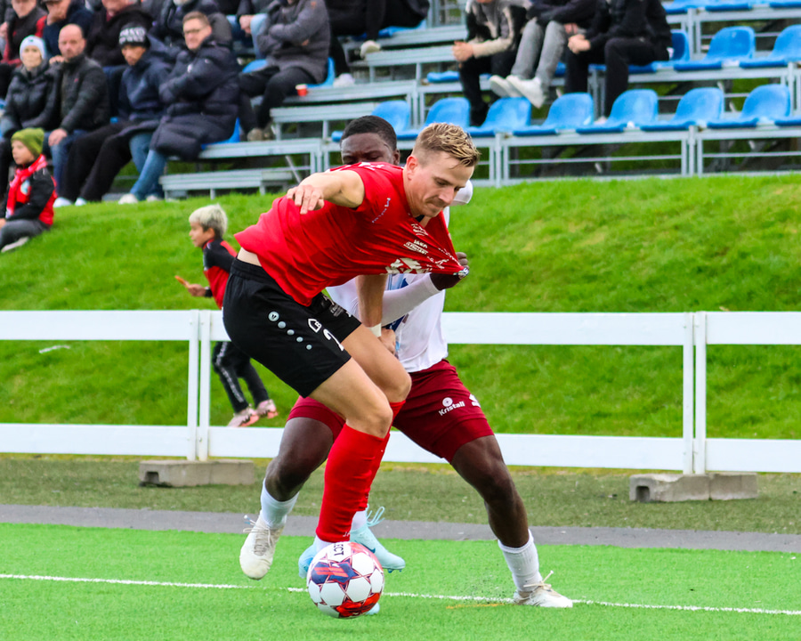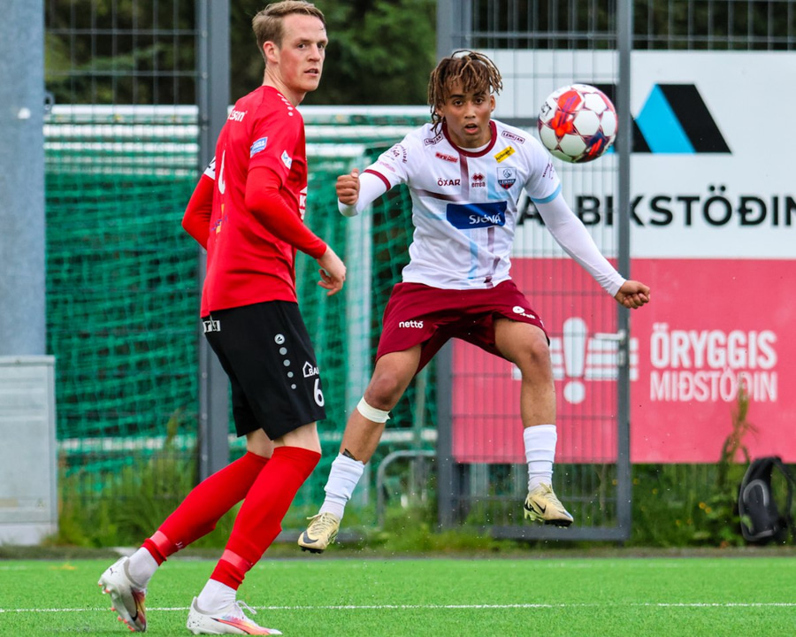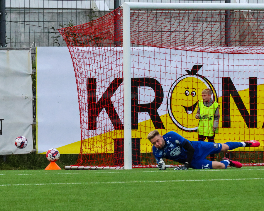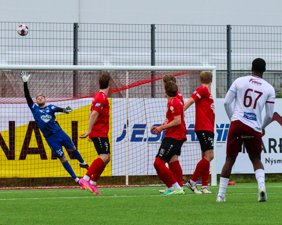 Oliver fær boltann inni á teignum og tekur sinn tíma. Hann sér opnun og nær skotinu á markið sem Viktor ver stórkostlega. Elmar er þá mættur á frákastið og nær að pota boltanum í netið.