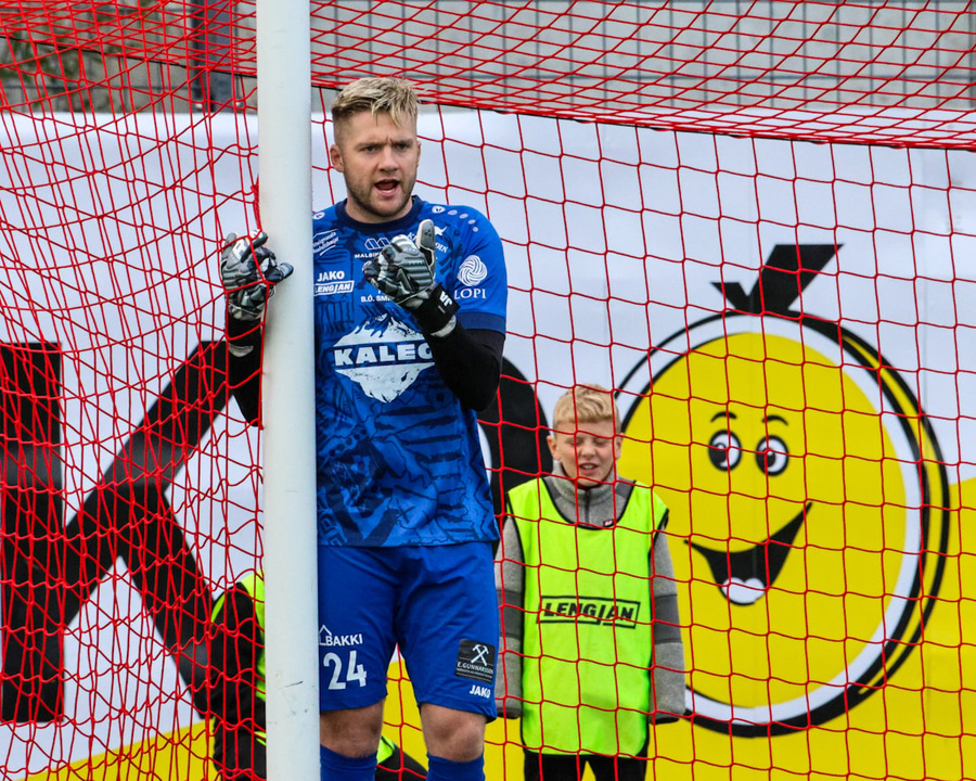 Róbert Hauks með skot fyrir utan teig og Jökull ver í horn. Loksins eitthvað að gera fyrir Jökul!