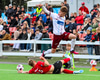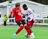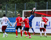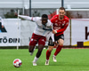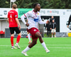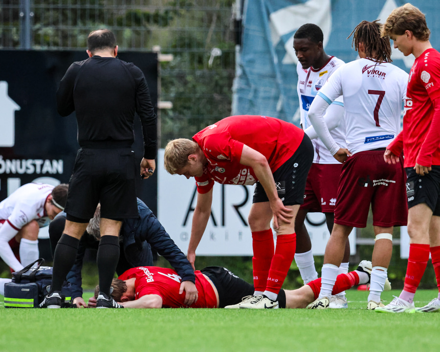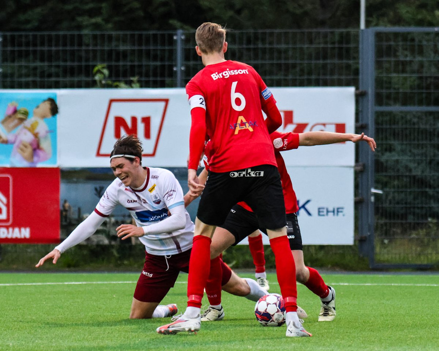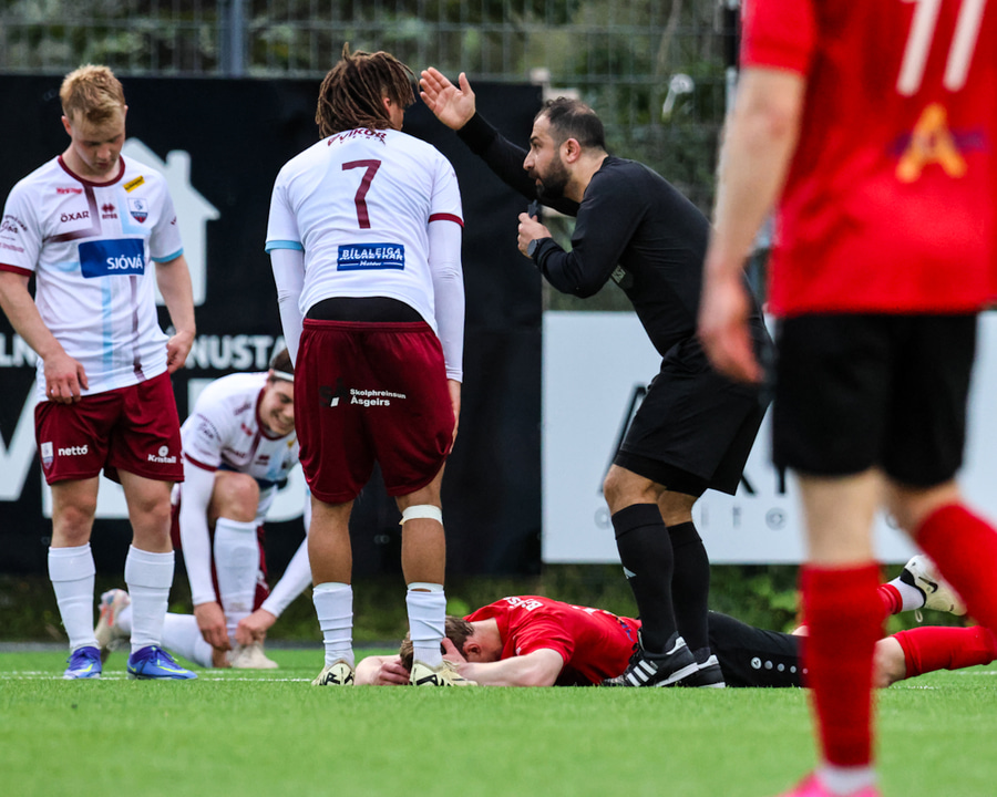 Omar Sowe fer niður í teignum og biður um vítaspyrna en fær ekkert fyrir sinn snúð.