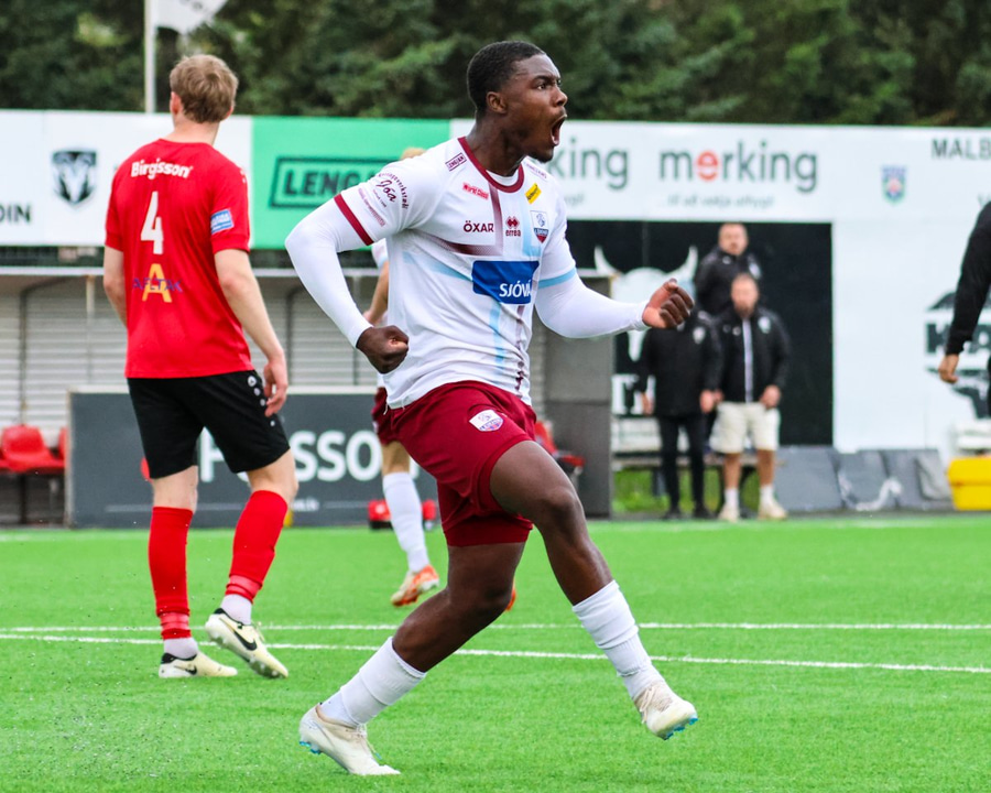 Omar Sowe tók spyrnuna sem fór rétt yfir. Strauk þverslána!