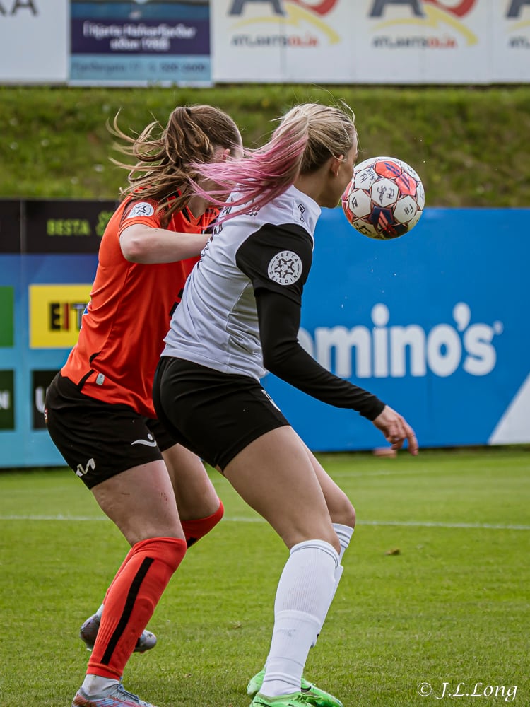 Íris Una stálheppinn að sleppa við spjald. Togar vel og lengi í treyju sóknarmanns sem er við það að komast framhjá henni. Brot dæmt en tiltal látið duga.