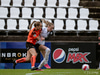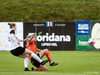 Ljótur árekstur á vellinum. Arna Eiríks og Helga Guðrún skella saman við varamannabekkina. Helga Guðrún fer verr út úr því en er fljót á lappir.