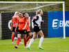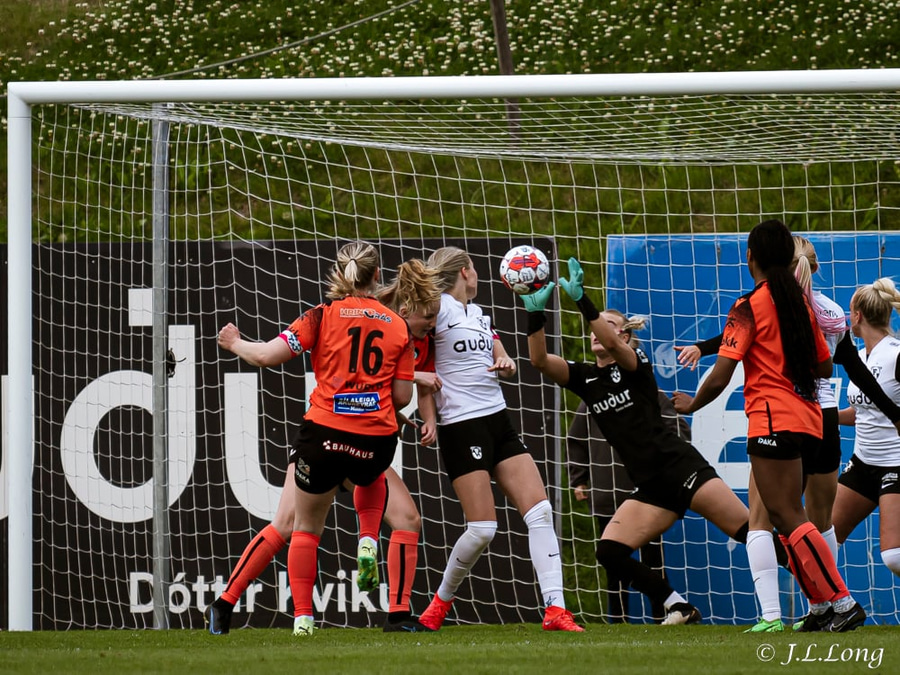 Hornspyrna frá vinstri inn á teiginn. Sýnist það vera Eva Rut sem er fyrst á boltann en Aldís í markinu ver.