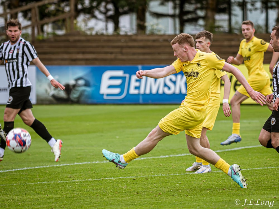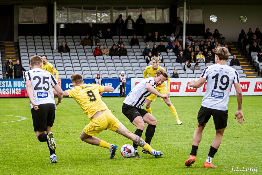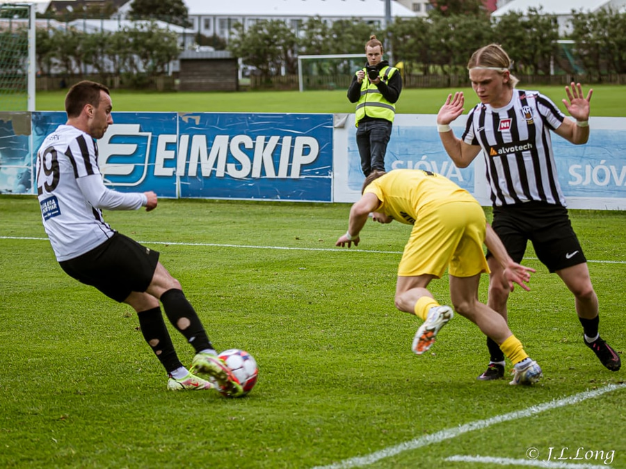 Kjartan Kári tekur aukaspyrnu inn á teiginn. Ísak Óli nær að skalla boltann fyrir markið en enginn náði snertingu á boltann og koma honum inn.