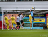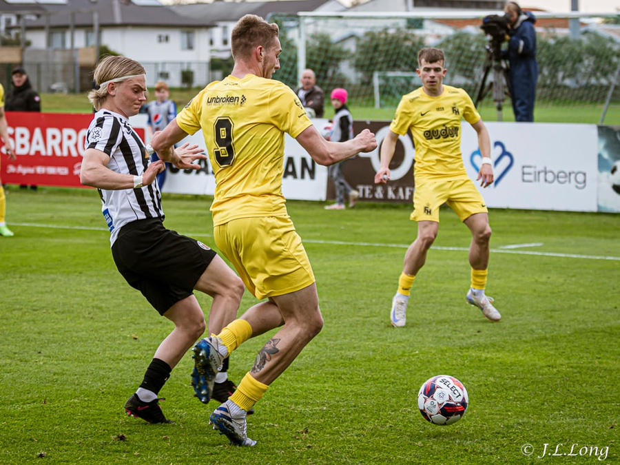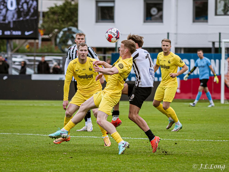 Luke Rae fær boltann frá Aroni Sig og kemur með góðan bolta inn á teiginn. Boltinn er á leiðinni á Benoný Breka en hann dettur niður eftir átök við Dusan. Þeir detta reyndar báðir niður.