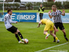 Kjartan Kári tekur spyrnuna inn á teiginn sem Axel Óskar skallar í slána af mjög svo stuttu færi!