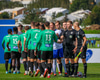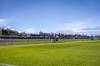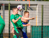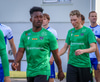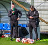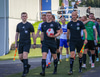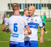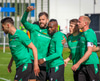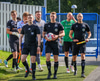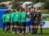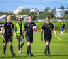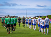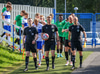 Liðin ganga hér inn á völlinn. Heimamenn í hvítu treyjum og bláum stuttbuxum og gestirnir í grænum treyjum og svörtum stuttbuxum.