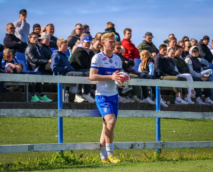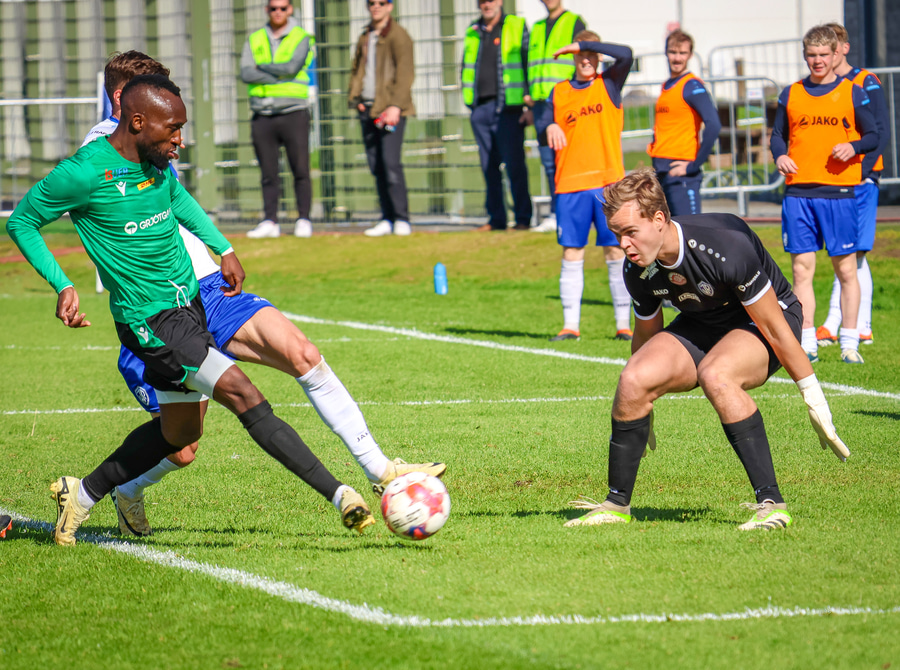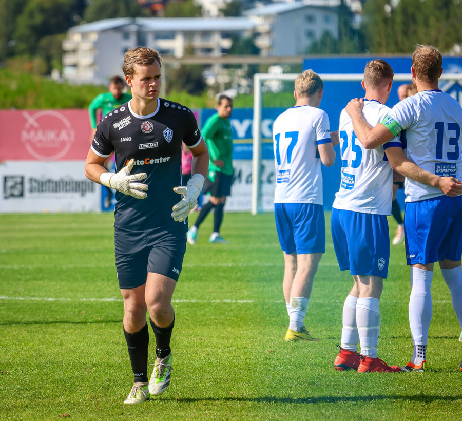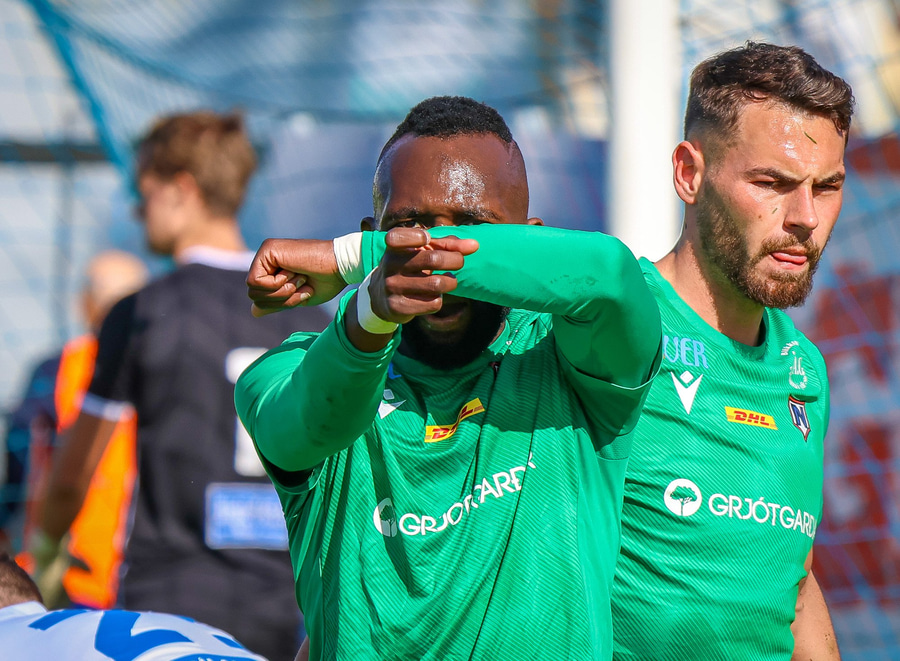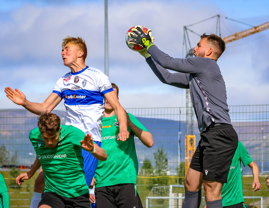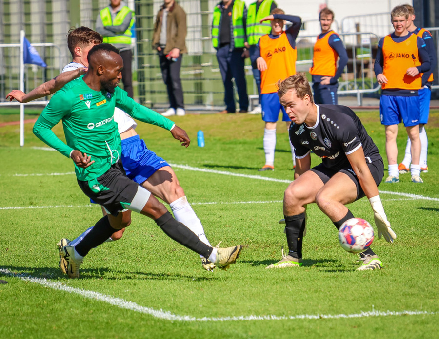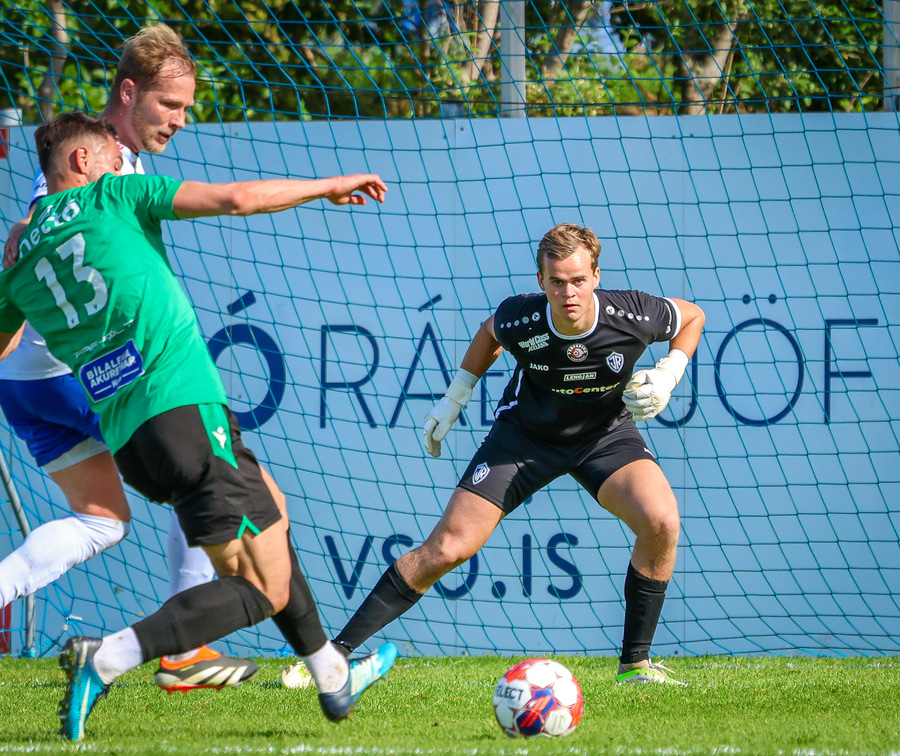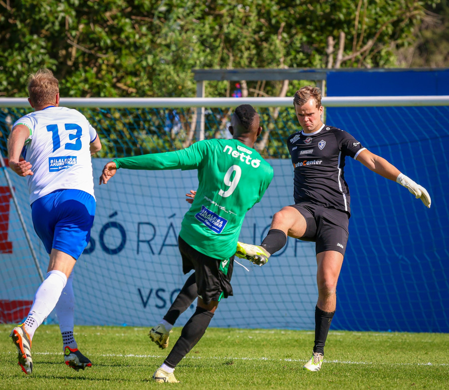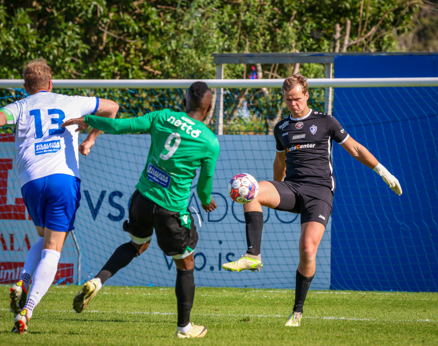 Boltinn berst til Oumar sem er aleinn efst í teignum. Vilhelm kemur út á móti honum og gerir vel í að gera sig stóran og blokka skotið.