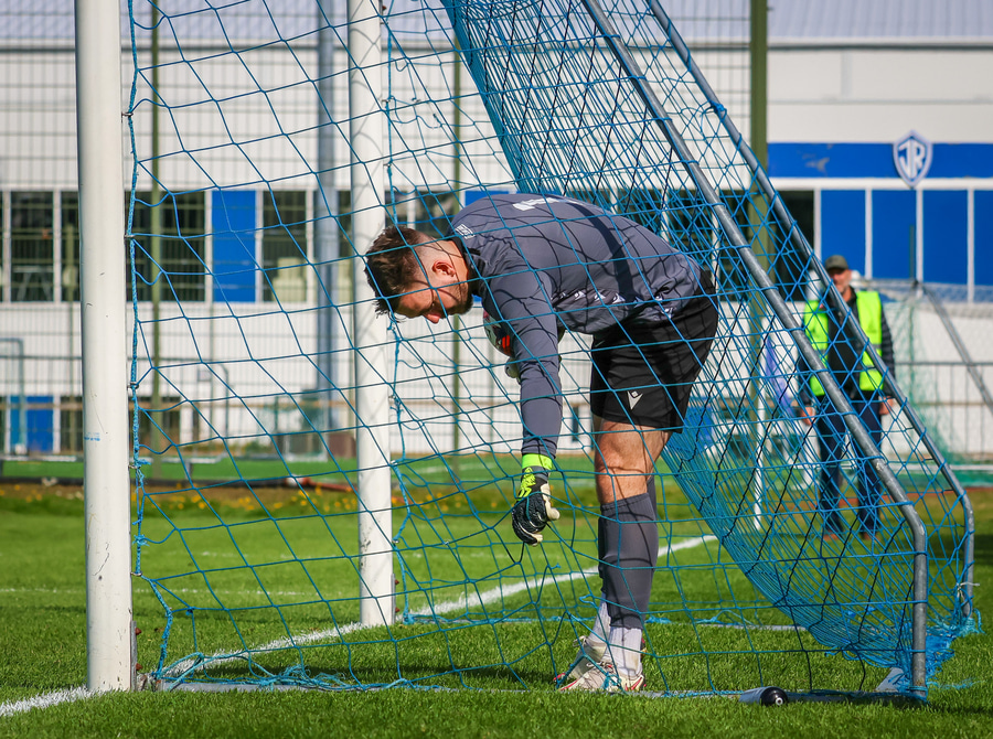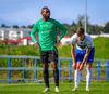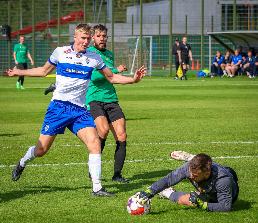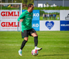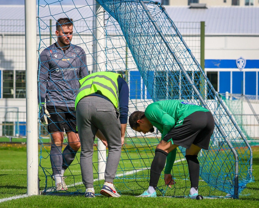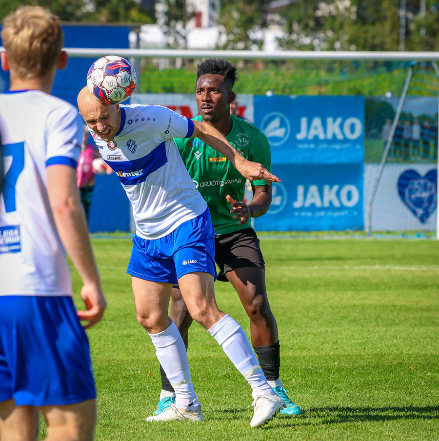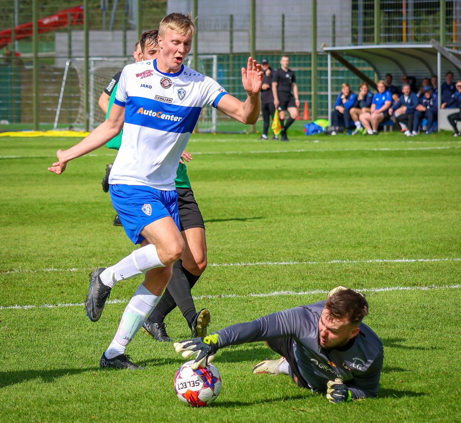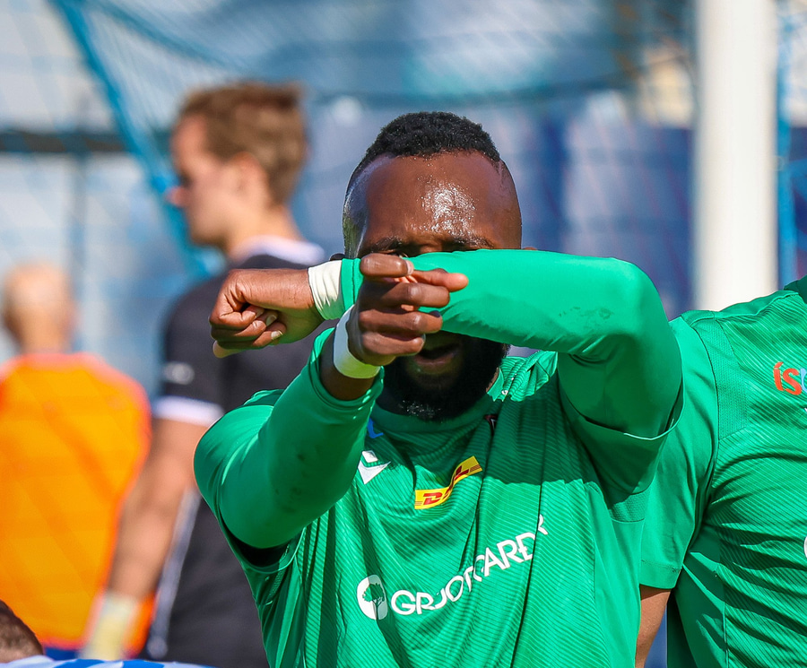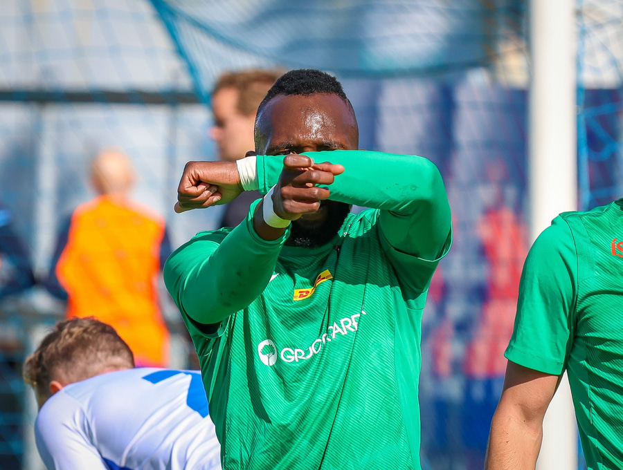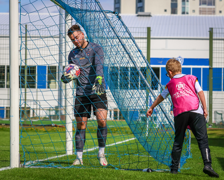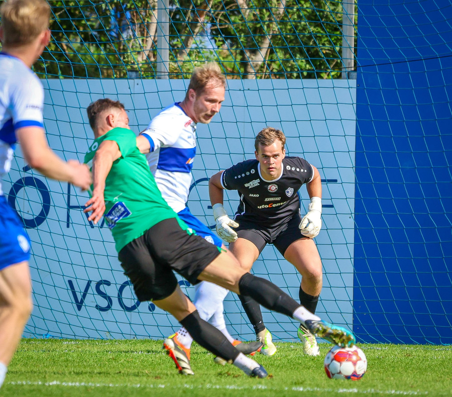 Boltinn berst til Oumar sem er aleinn efst í teignum. Vilhelm kemur út á móti honum og gerir vel í að gera sig stóran og blokka skotið.
