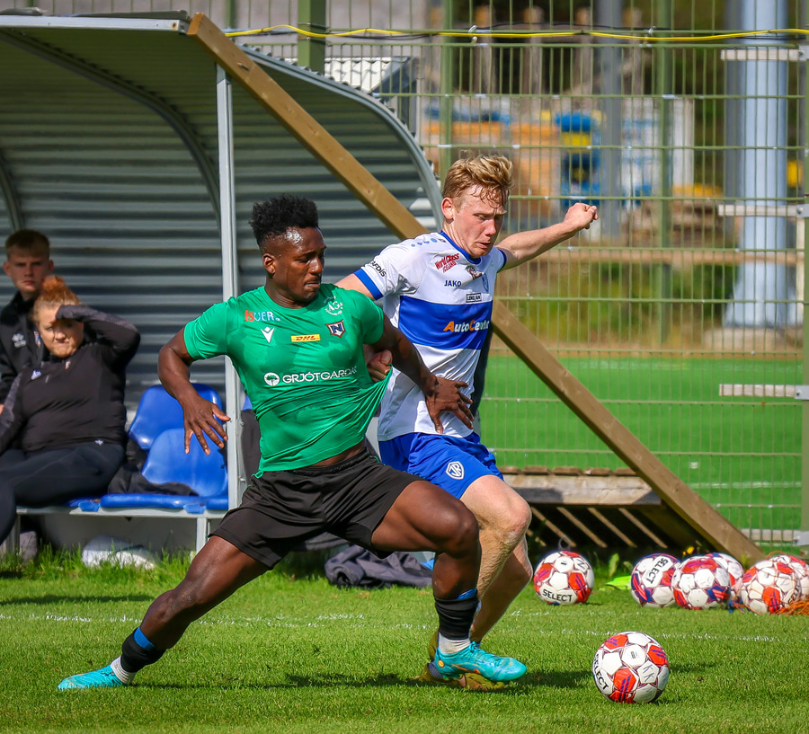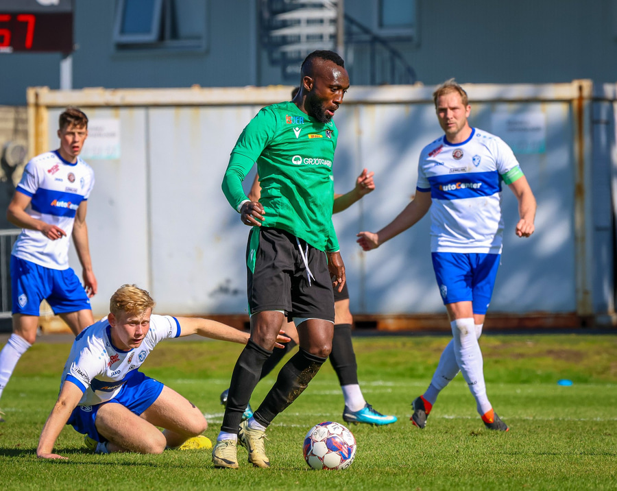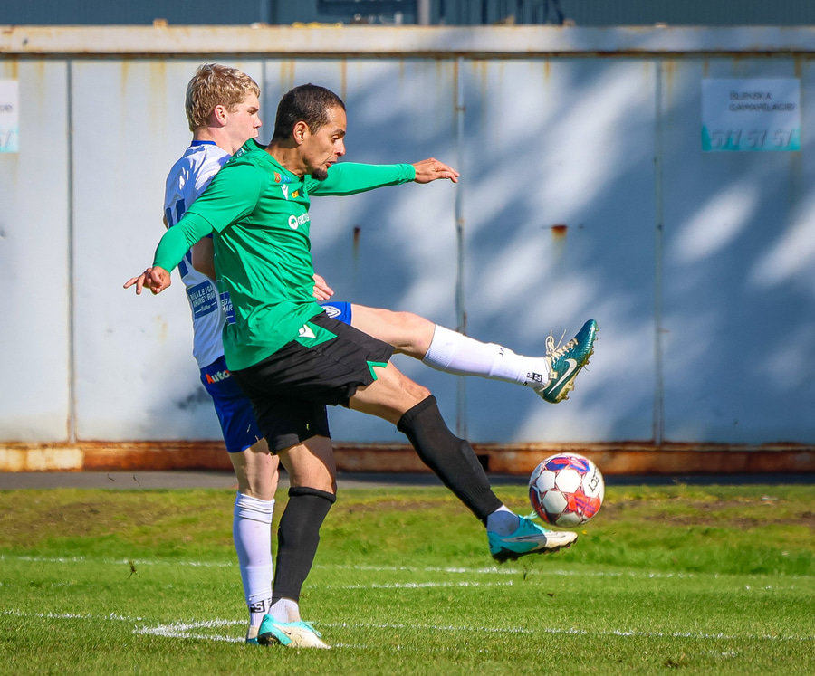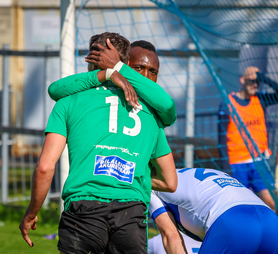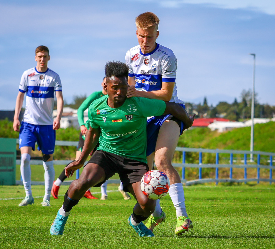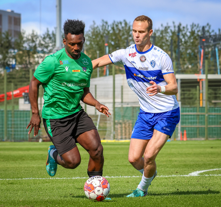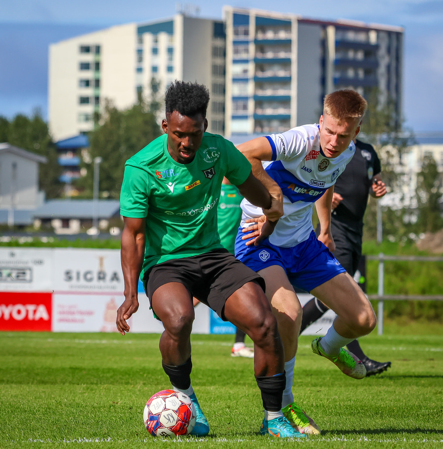 Kenneth kemur boltanum inn í teig á Oumar sem nær að pota boltanum í netið.