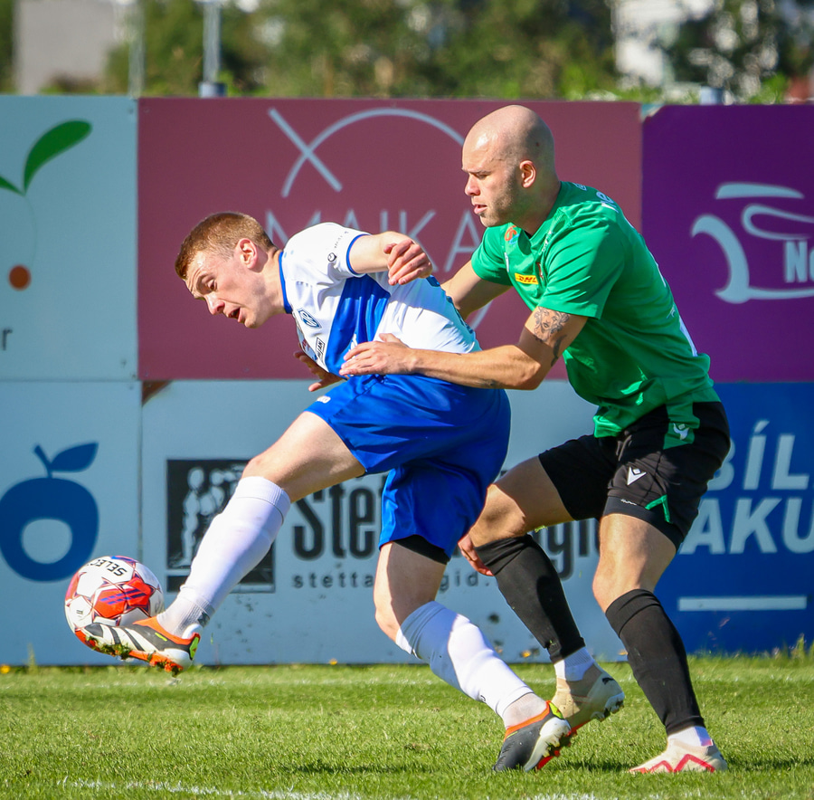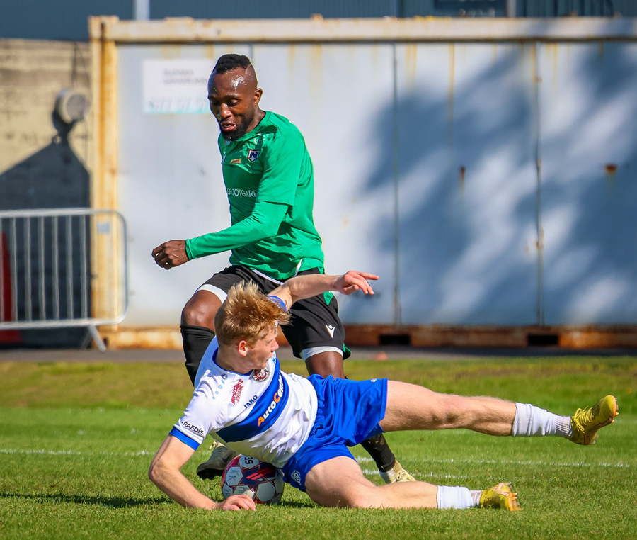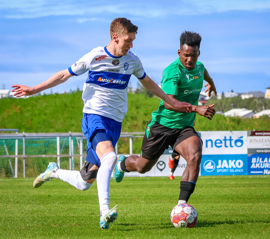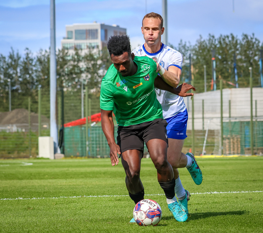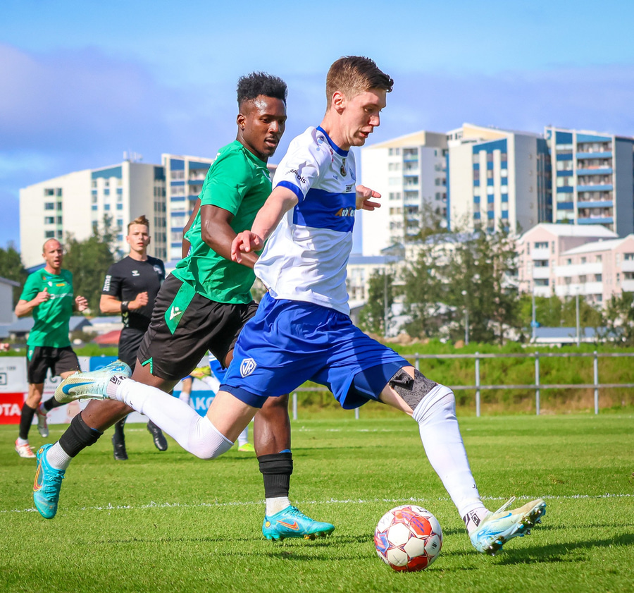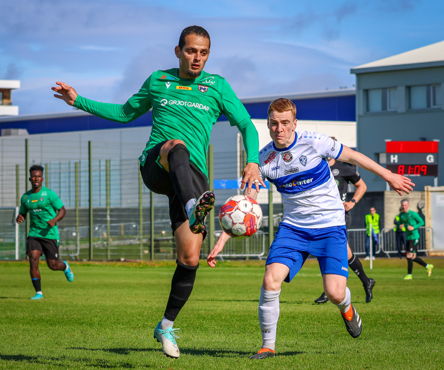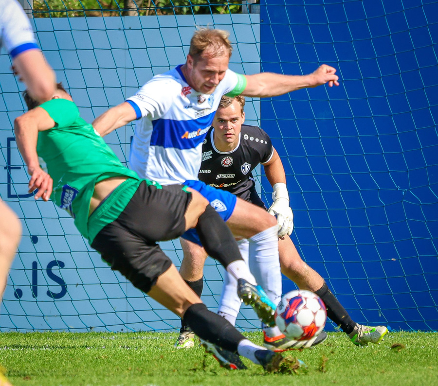 Kenneth kemur boltanum inn í teig á Oumar sem nær að pota boltanum í netið.