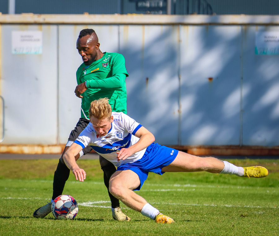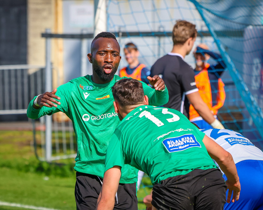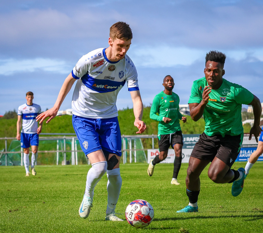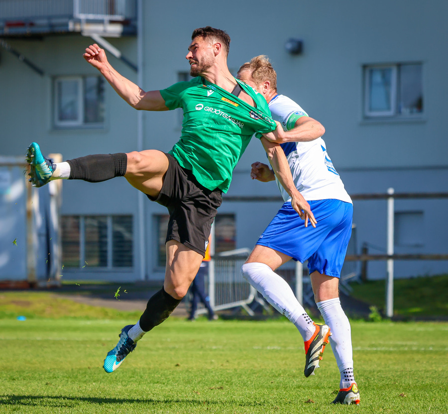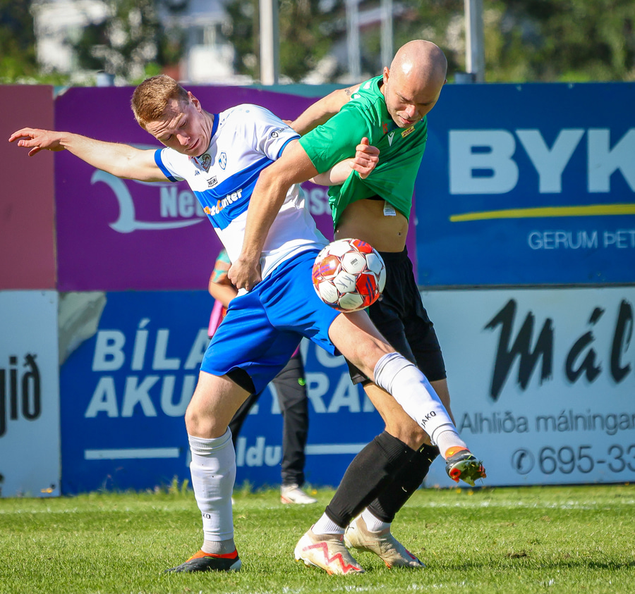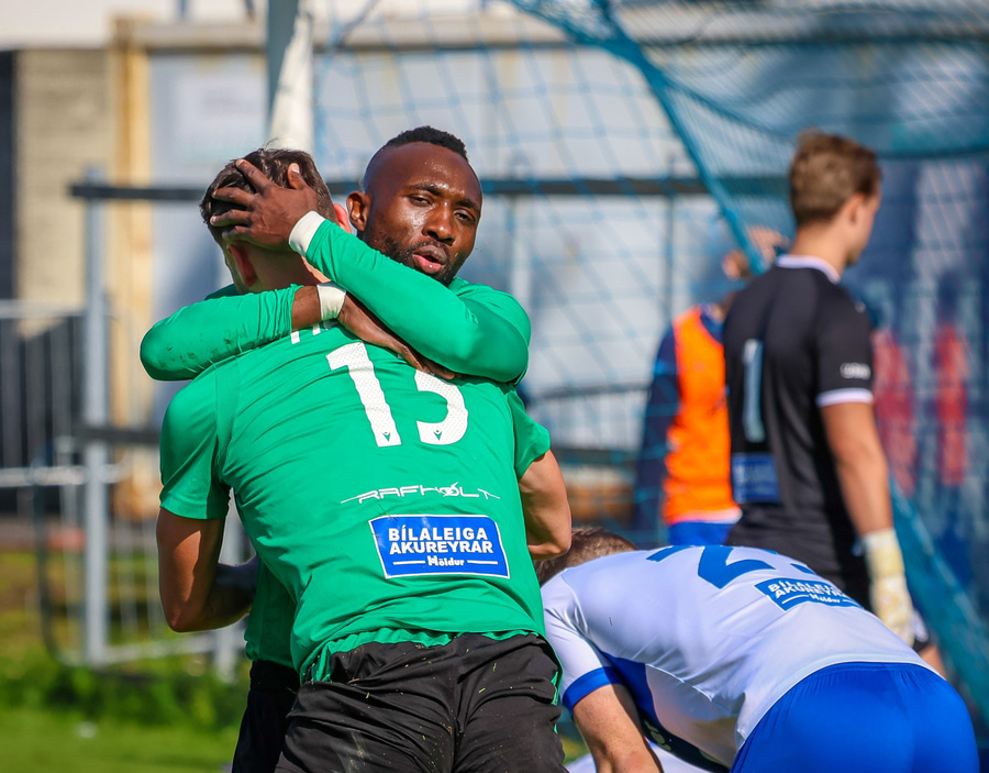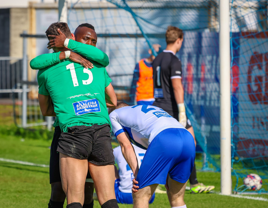 Kenneth kemur boltanum inn í teig á Oumar sem nær að pota boltanum í netið.