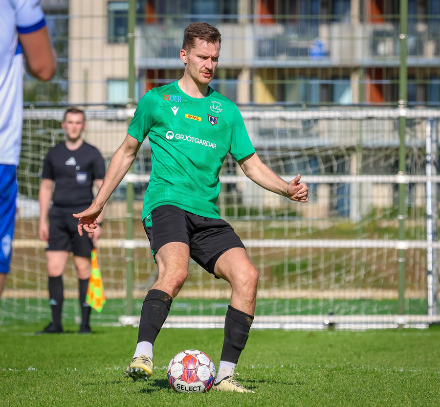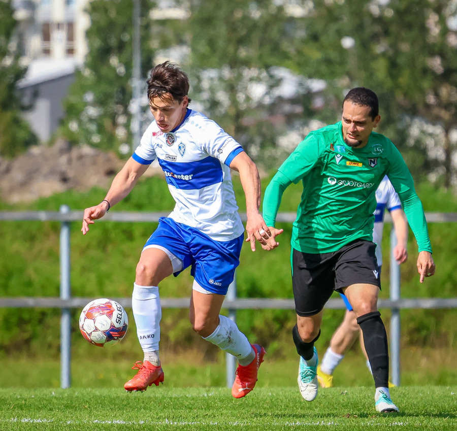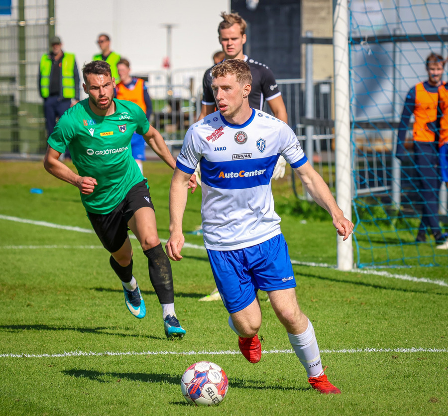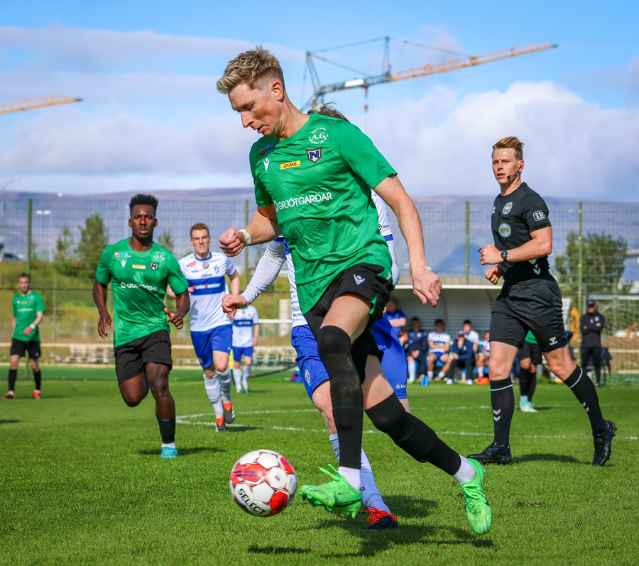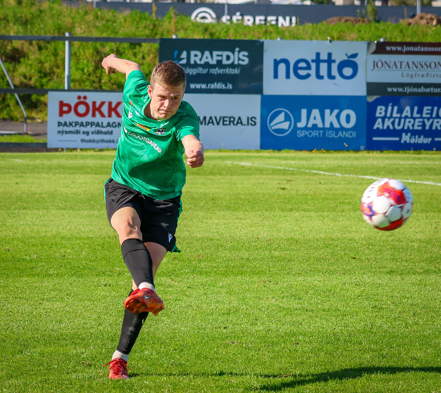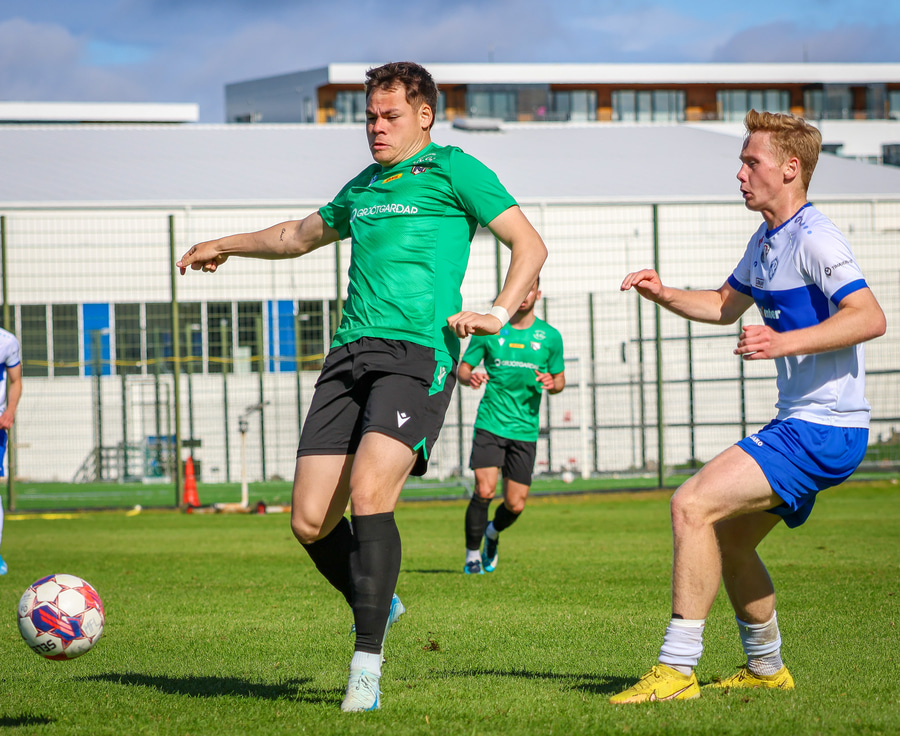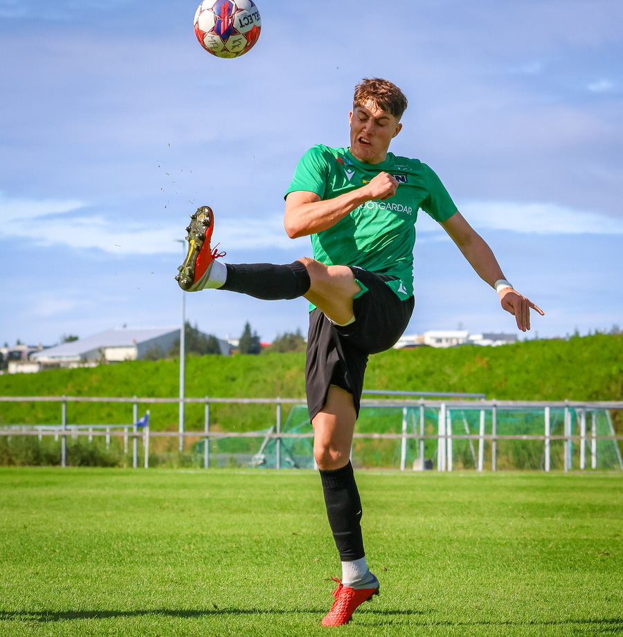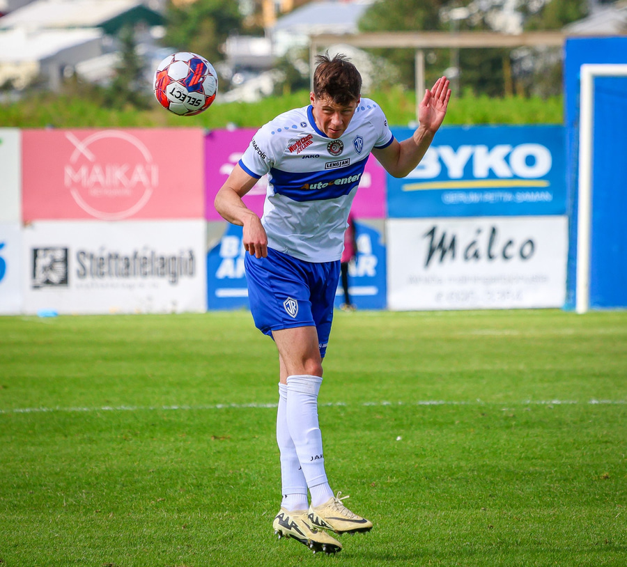 Kenneth á fyrirgjöf af hægri kantinum sem Dominik reynir að kasta sér fyrir en hann rétt missir af botlanum.