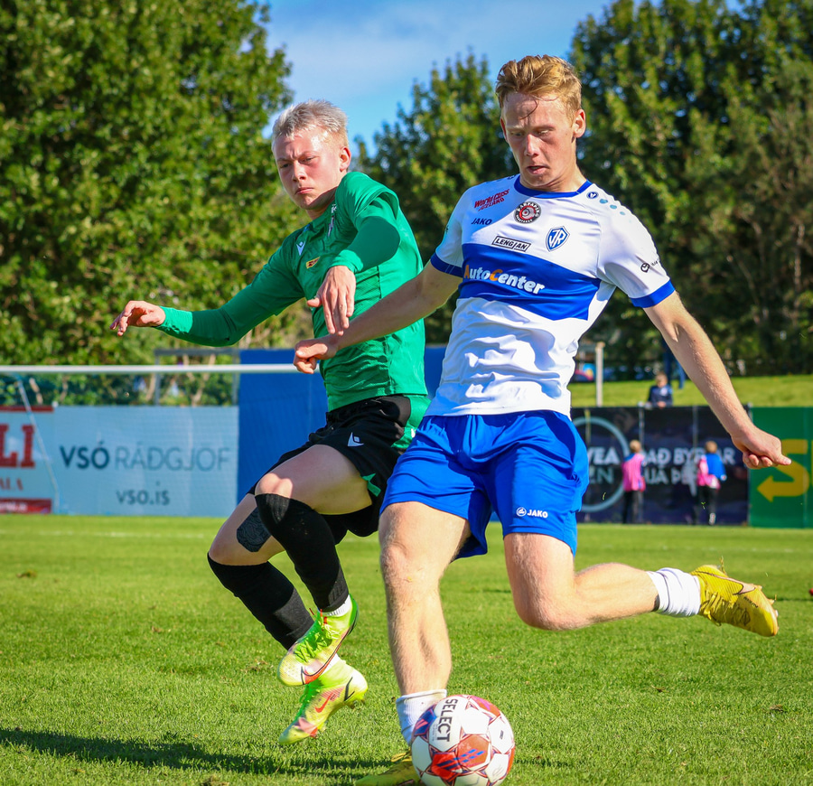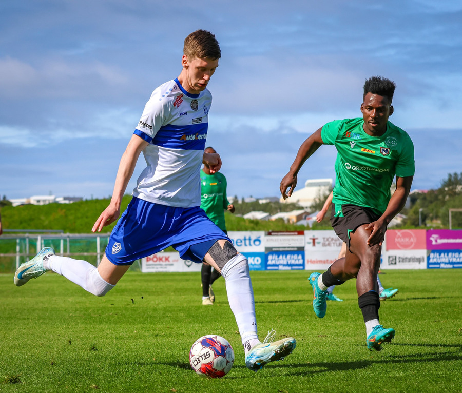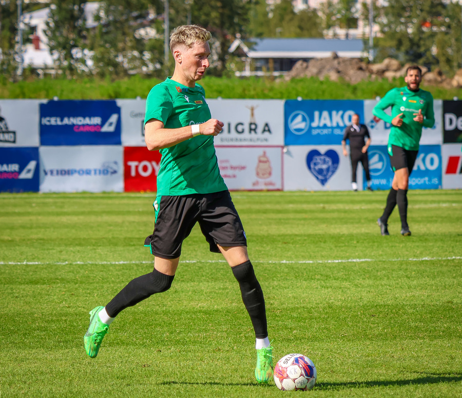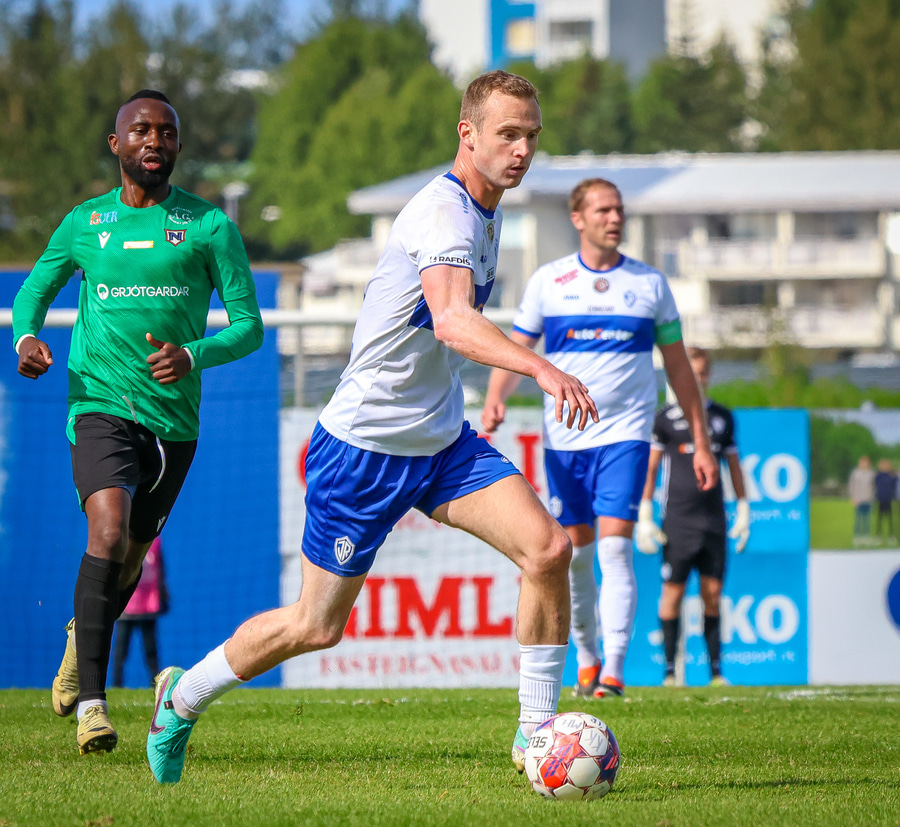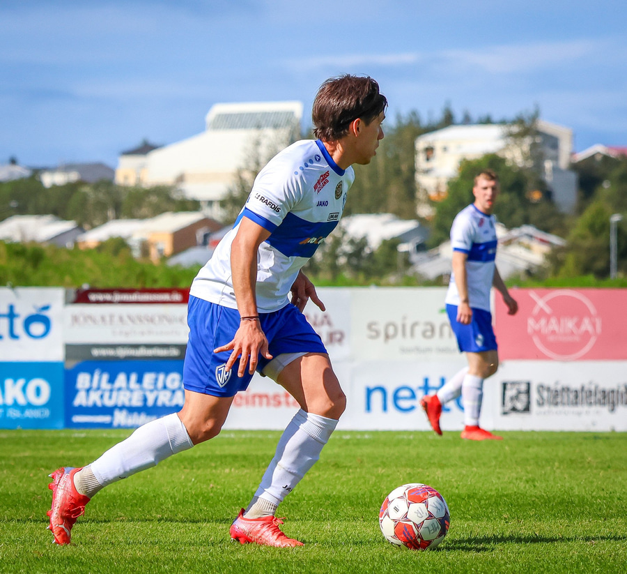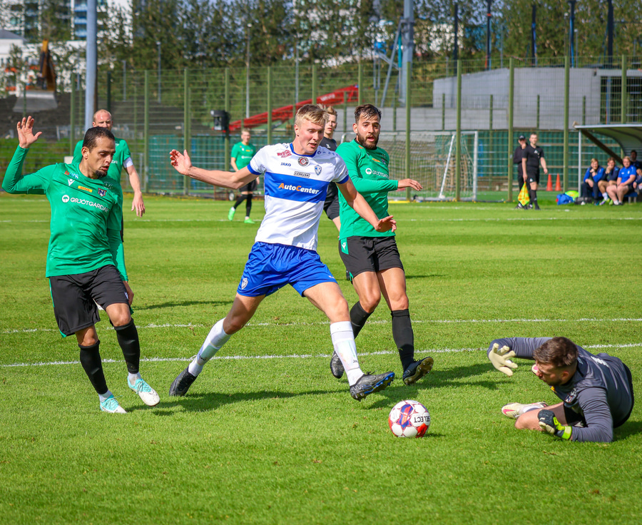 Dominik fær boltann við vítateiginn í góðri skotstöðu og lætur vaða á markið. Vilhelm ver boltann út í teig þar sem Kenneth er aleinn en Vilhelm ver gríðarlega vel frá honum.