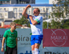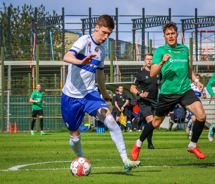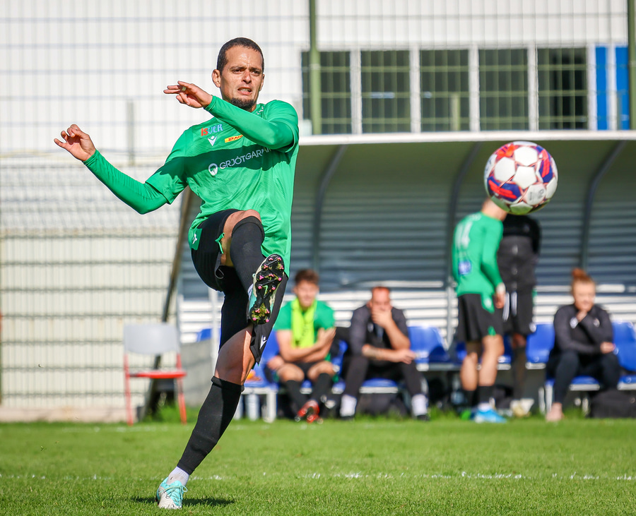 Renato gefur boltann á Hákon sem er við D-bogann. Hann fer vinstra megin inn í teiginn og lætur vaða en Aron sér við honum og ver í hornspyrnu.