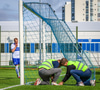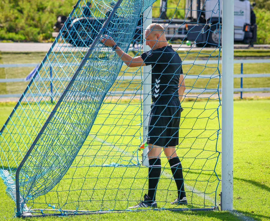 Það virðist vera gat á hliðarnetinu í marki Njarðvíkur. Boltinn rúllaði inn í markið í gegnum það gat þegar ÍR fékk hornspyrnuna. Gæslan að teipa þetta saman í þessa stundina.