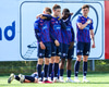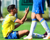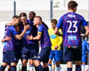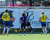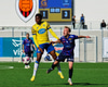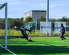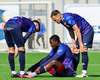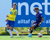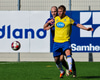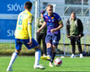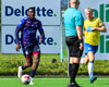 Róbert Quental með skot að marki en hann nær ekki miklum krafti í það. Svo ræða leikmenn Grindvíkinga sín á milli. ,,Hann fer alltaf á vinstri, alltaf," segja þeir um Róbert.