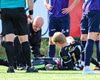 Núna fær Grindavík aukaspyrnu á stórhættulegum stað. Adam Árni fellur rétt fyrir utan teig og Færeyingurinn flautar.