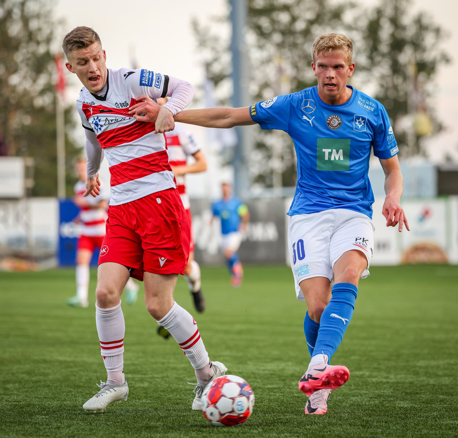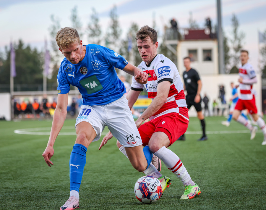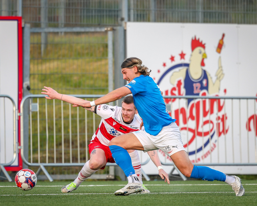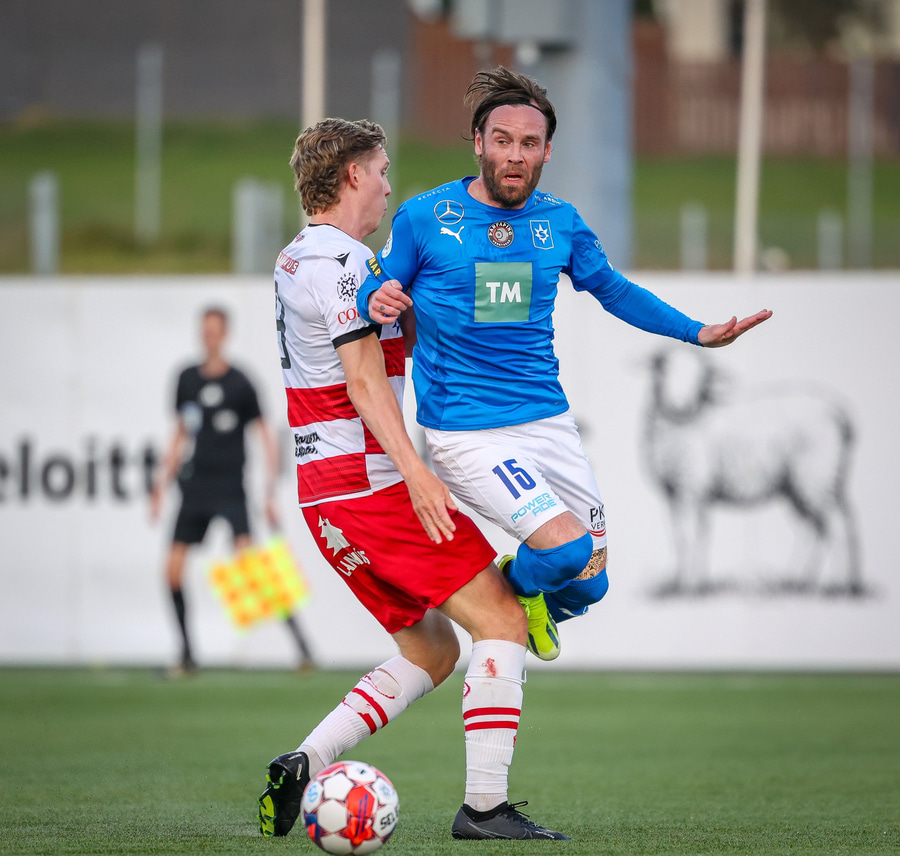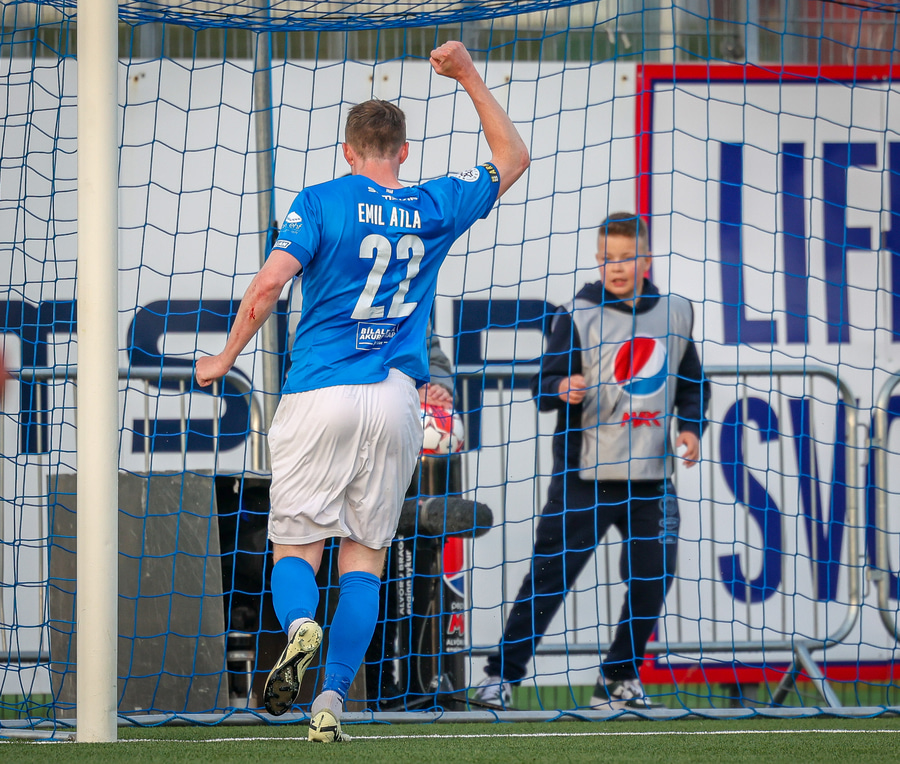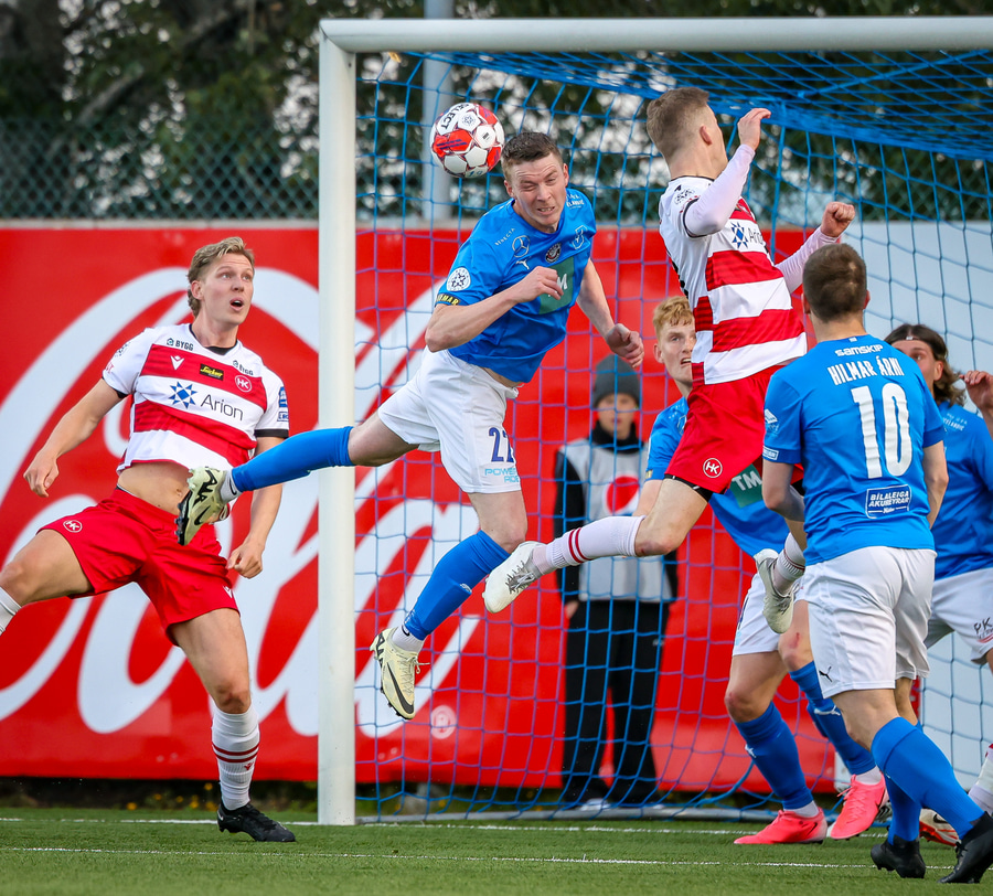 Hornspyrna á nærsvæðið þar sem Emil Atla er og nær skalla en hann er laus og beint á Christoffer Petersen.
