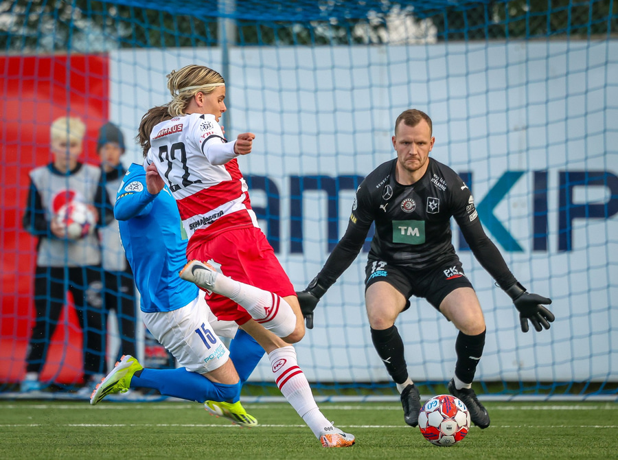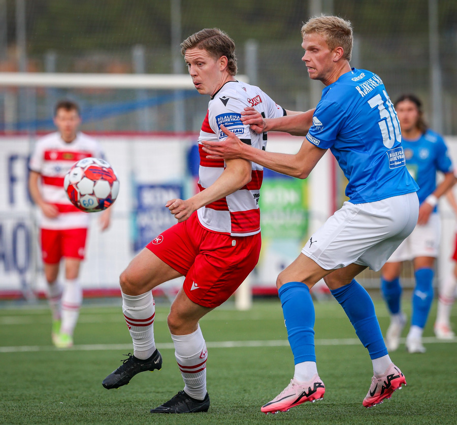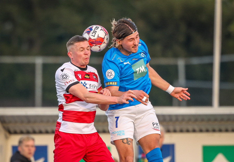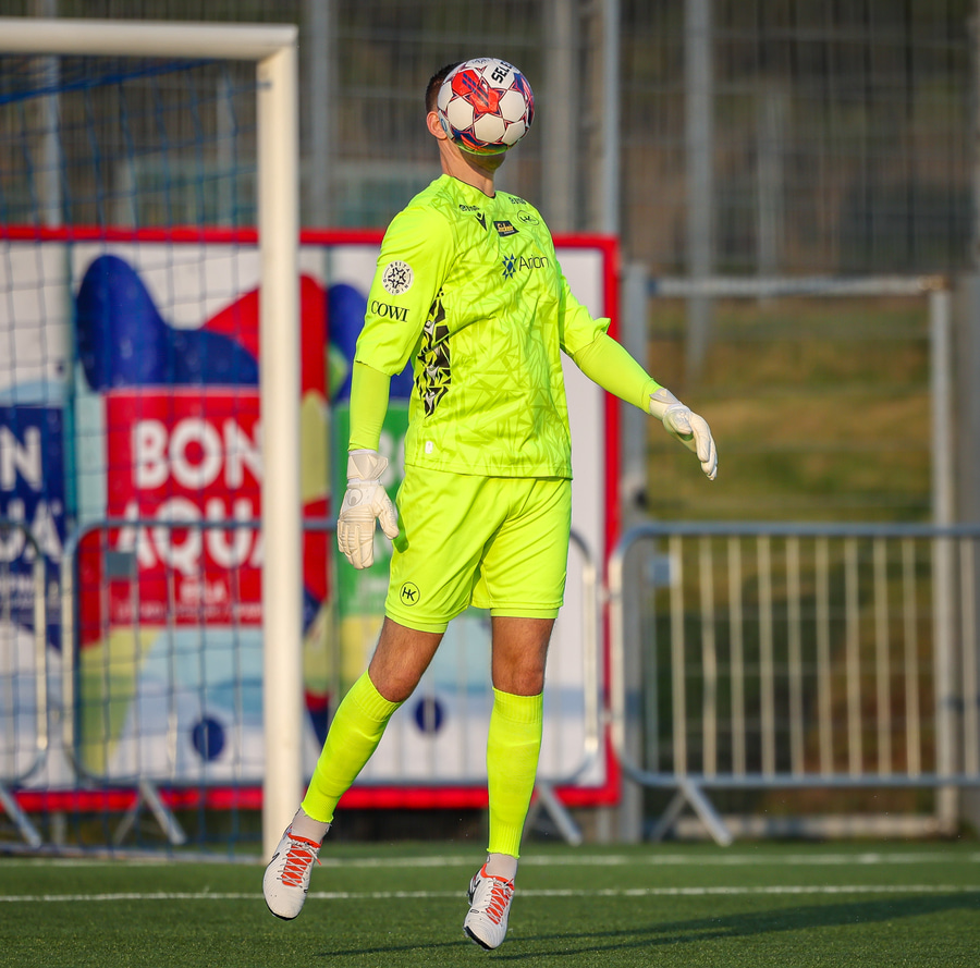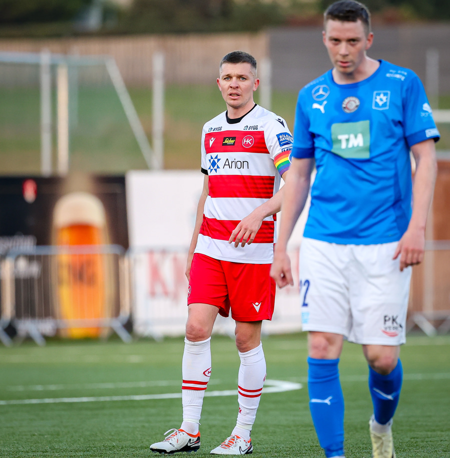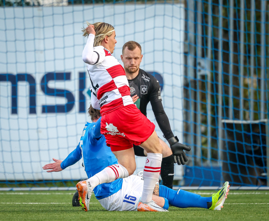 Hornspyrna á nærsvæðið þar sem Emil Atla er og nær skalla en hann er laus og beint á Christoffer Petersen.