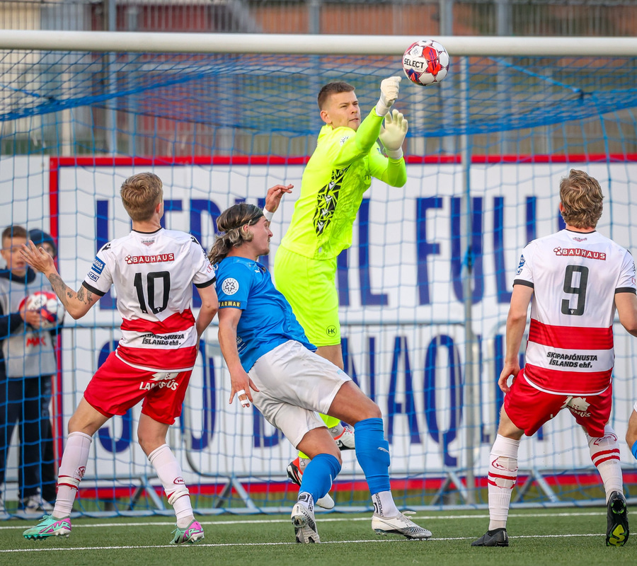Hornspyrnan góð á fjærstöng þar sem Eiður Gauti nær skallanum en hann er ekki kraftmikill og beint á Árna Snær.