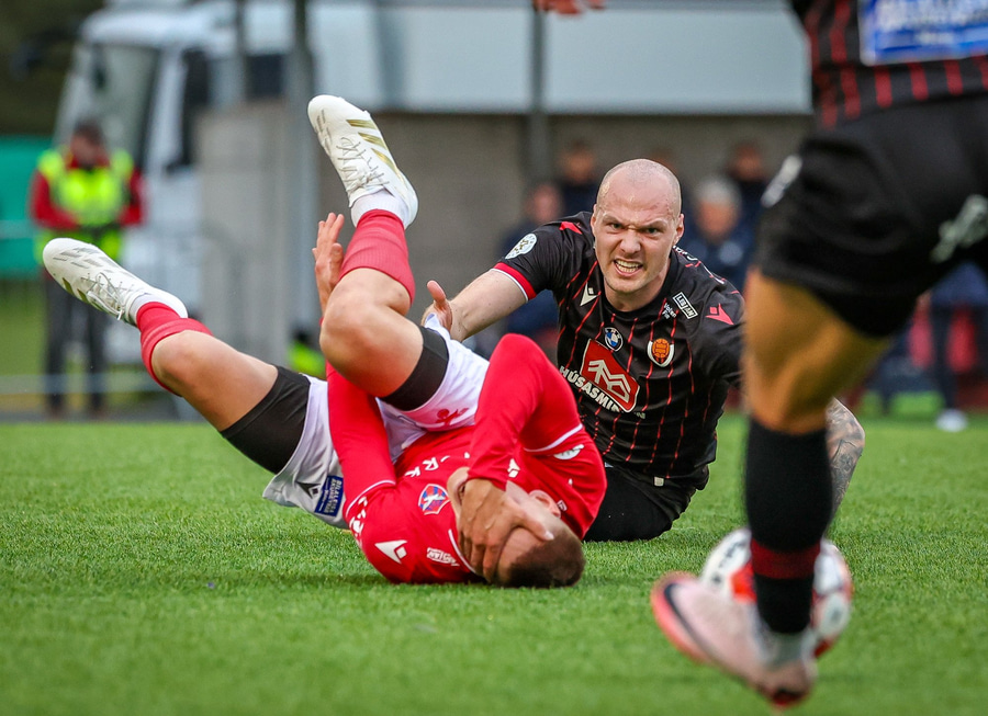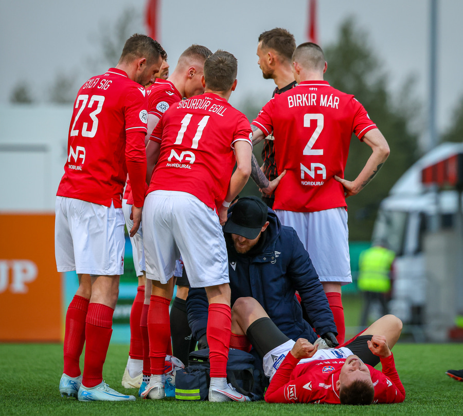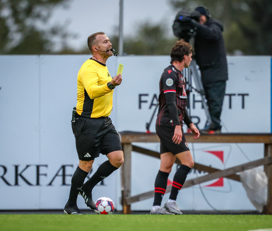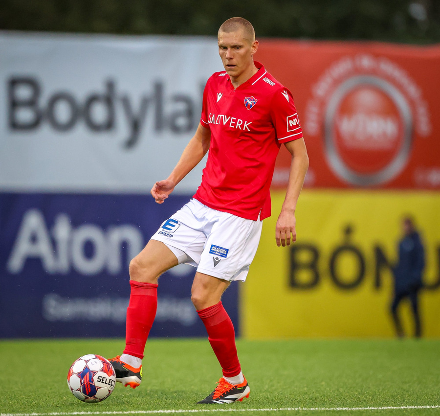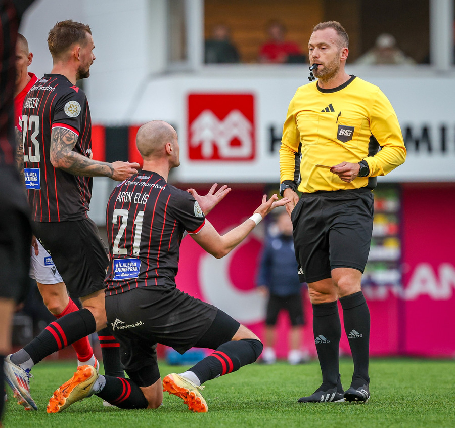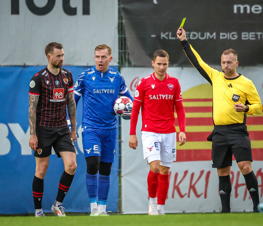 Fær seinna gula fyrir hraustlega tæklingu á Bjarna Mark. Furðuleg ákvörðun að láta vaða í þetta á gulu spjaldi.