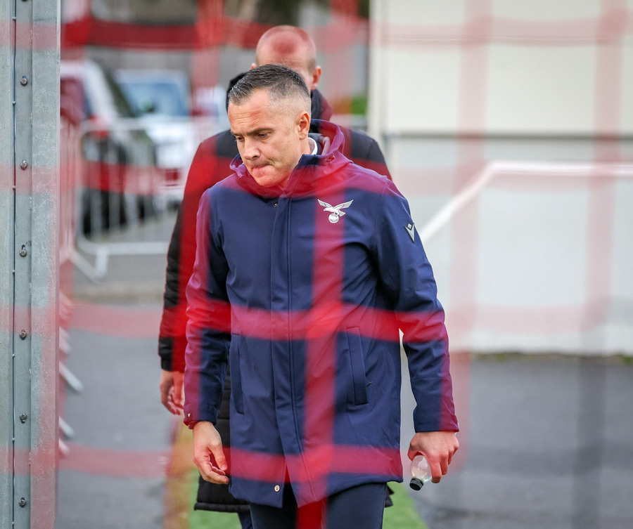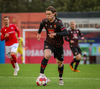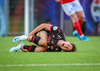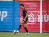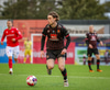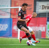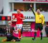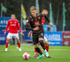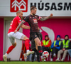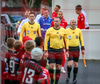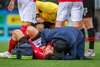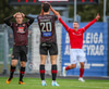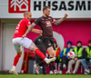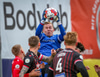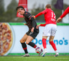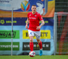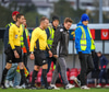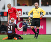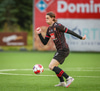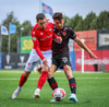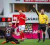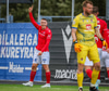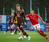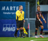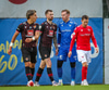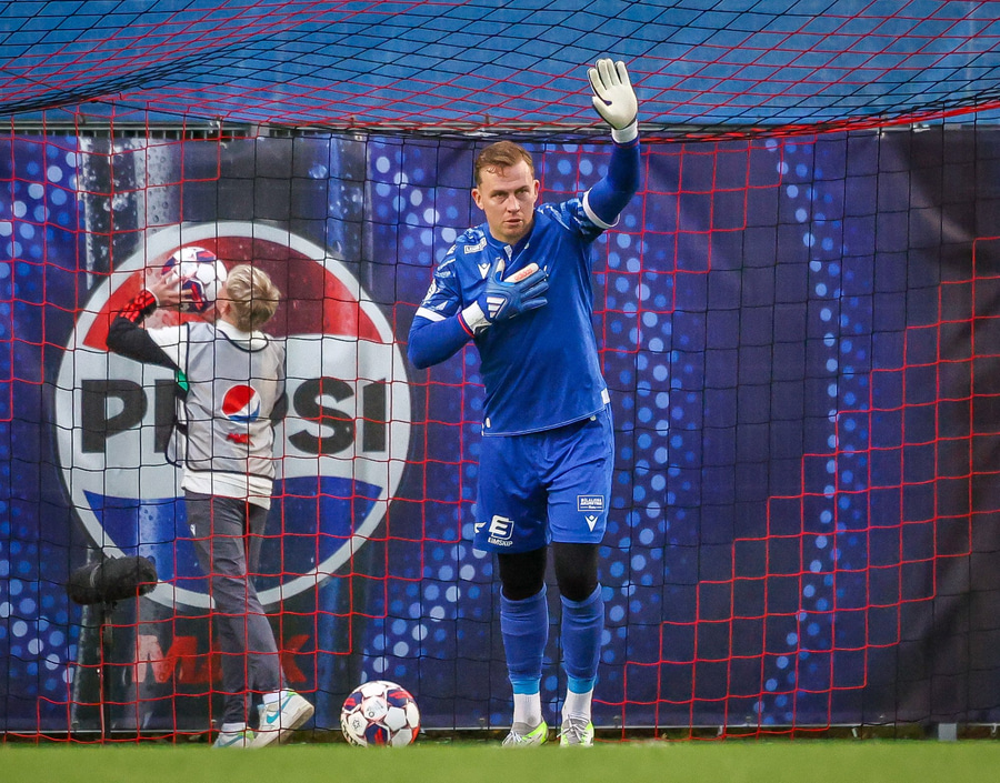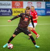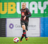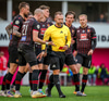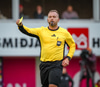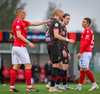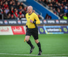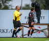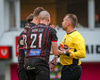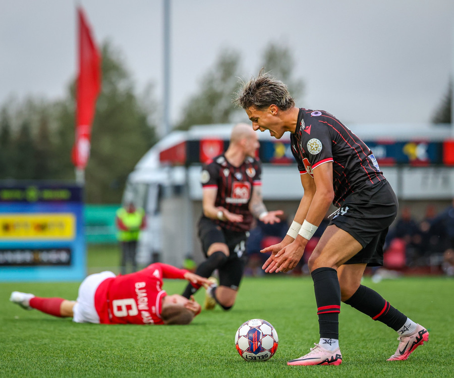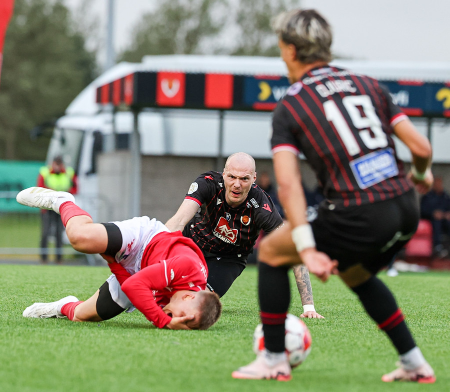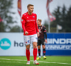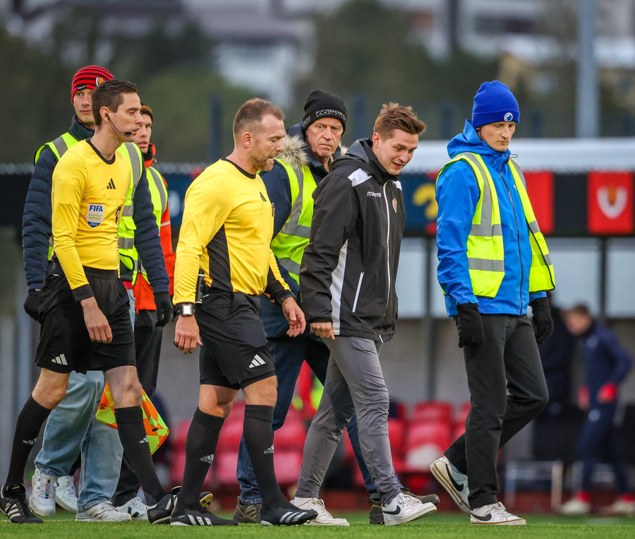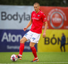 Fær seinna gula fyrir hraustlega tæklingu á Bjarna Mark. Furðuleg ákvörðun að láta vaða í þetta á gulu spjaldi.