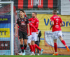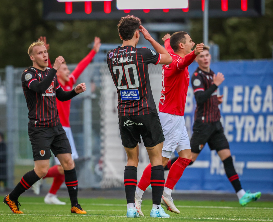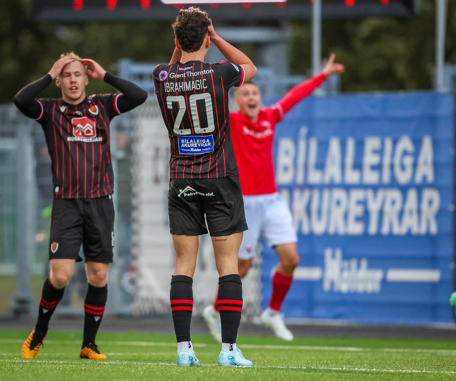 Ari Sigurpáls að komast í gegn, Ömmi langt út úr markinu og Hörður Ingi heldur í við hann. Ari bíður of lengi eftir að skjóta og skotið auk þess hátt yfir.
