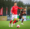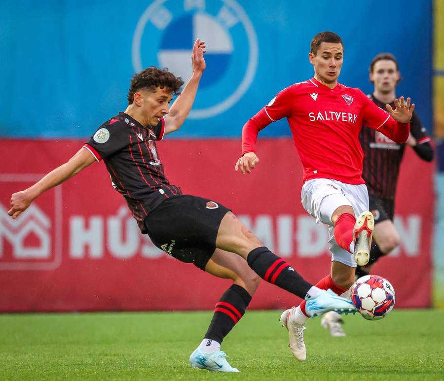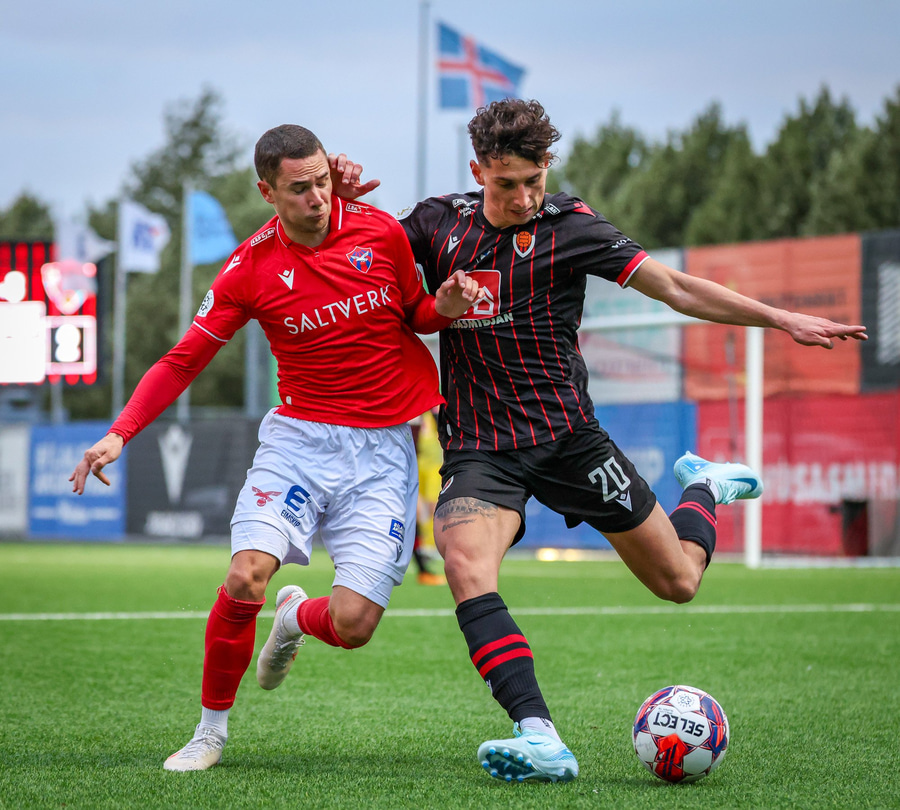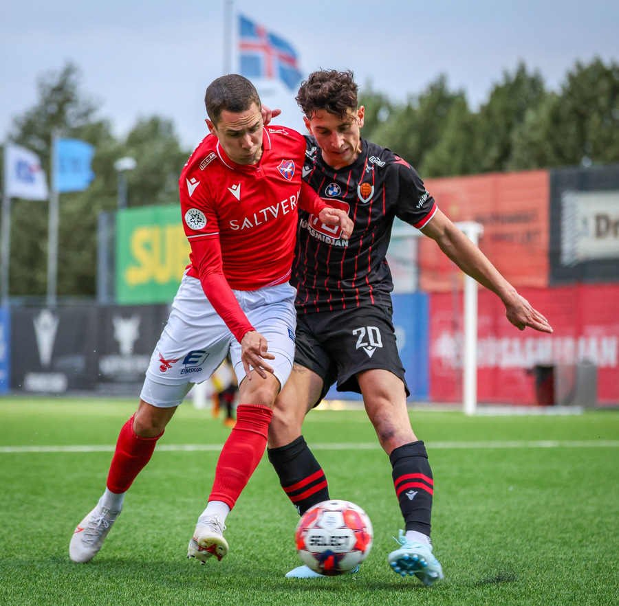 Karl Friðleifur með frábæran bolta fyrir markið í hættusvæðið en Niko Hansen örlítið of seinn og missir af honum.