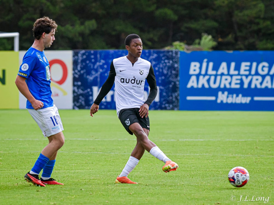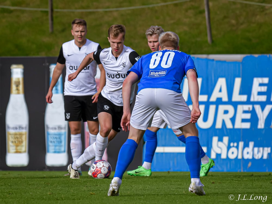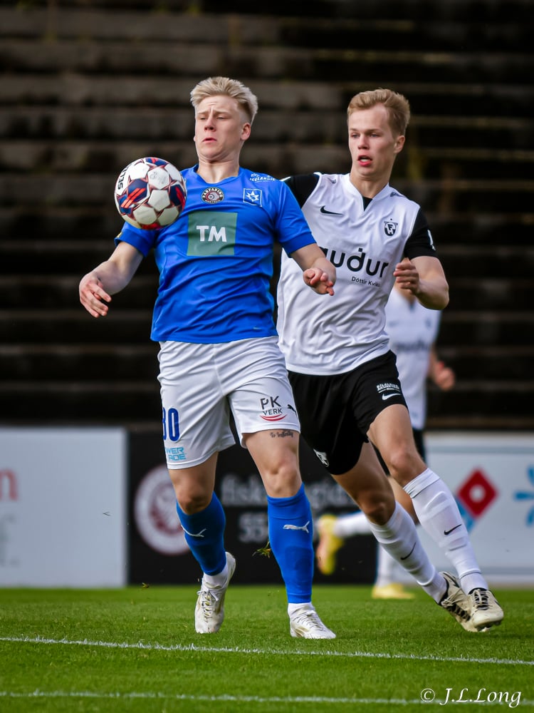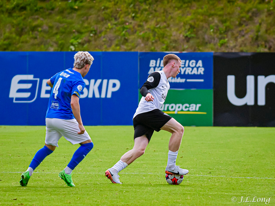 Skemmtilegir taktar í Kjartani Má. Fær háan bolta til sín sem hann kassar niður og gefur inn fyrir vörnin í fyrsta. Róbert Frosti sem var á hinum endanum á sendingunni gerði svo ekki alveg nógu vel, gaf fasta fyrirgjöf sem fór útaf í innkast.