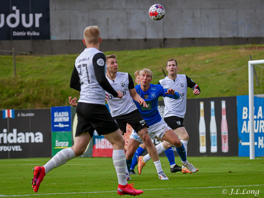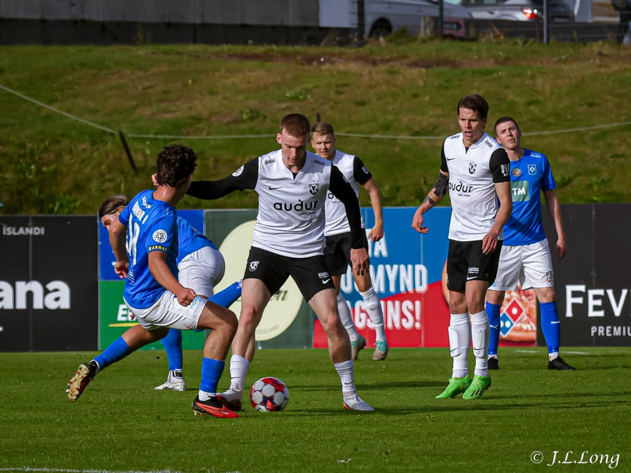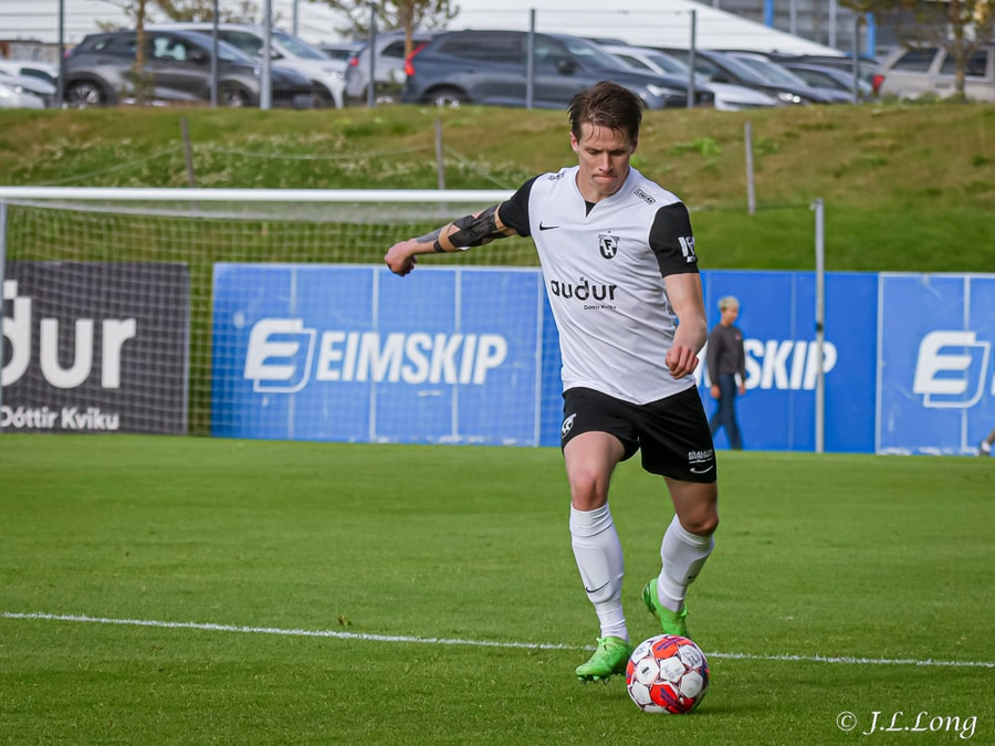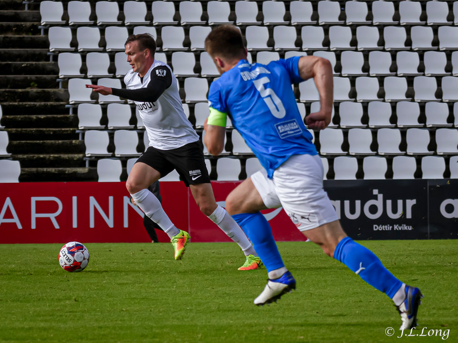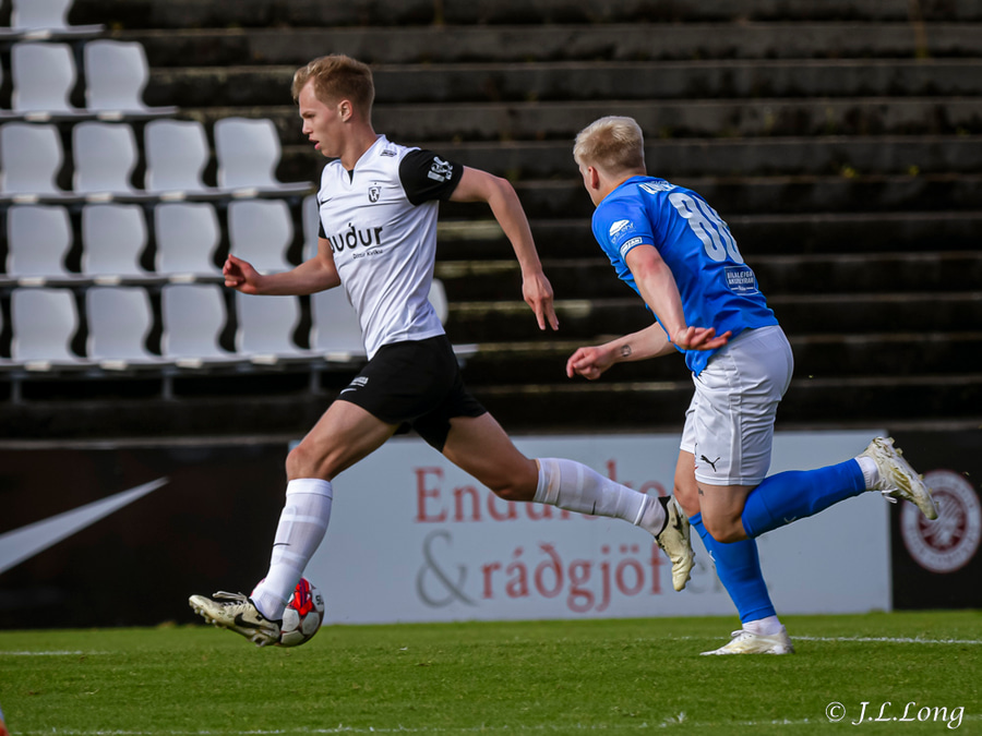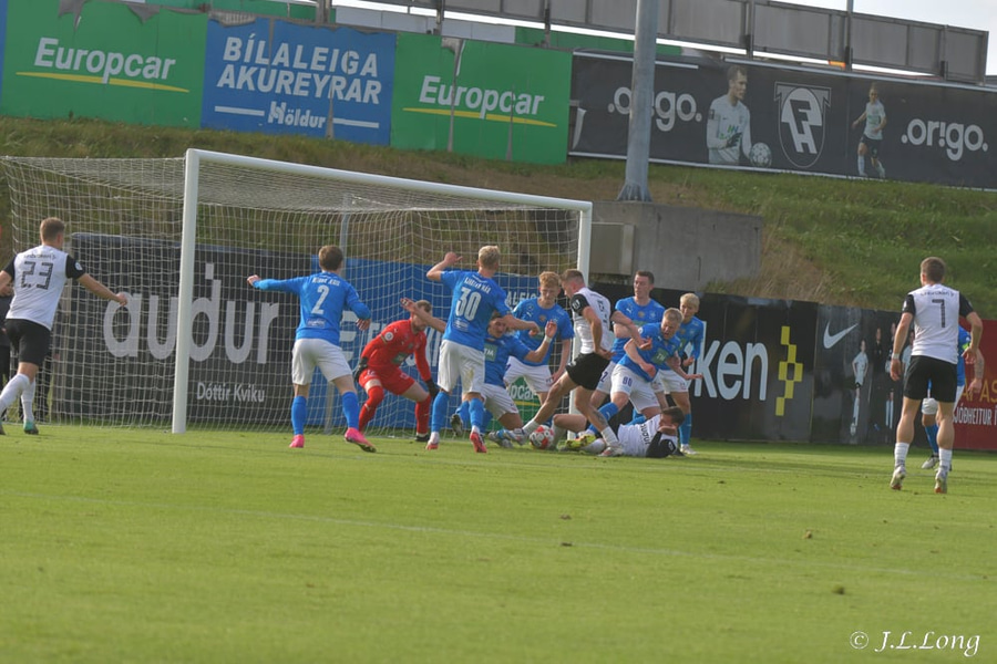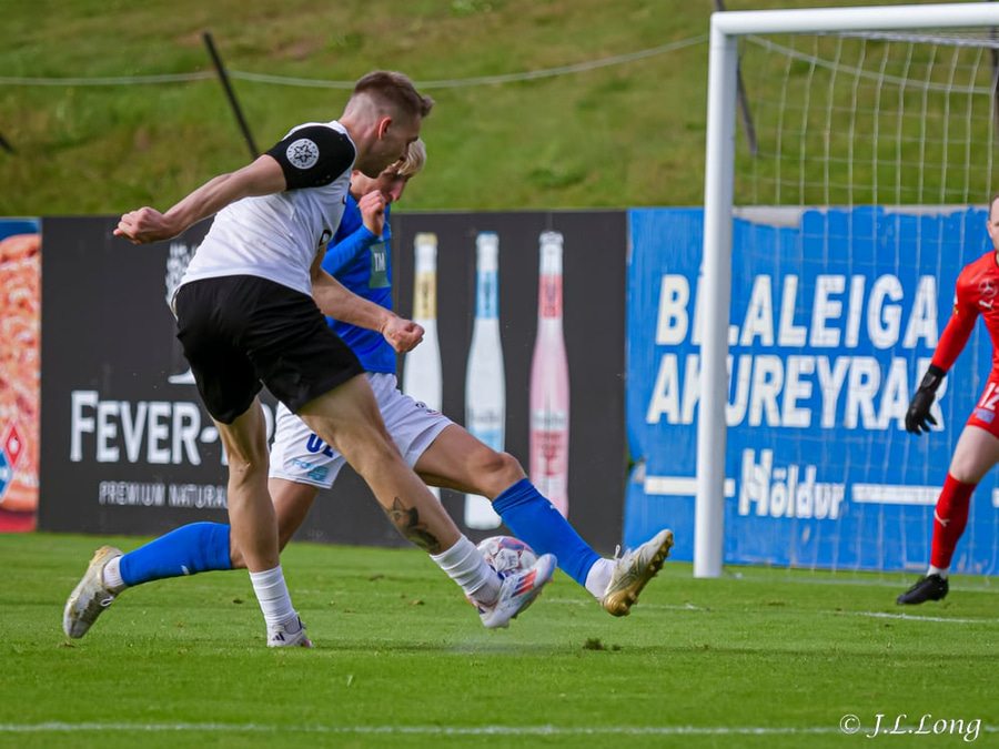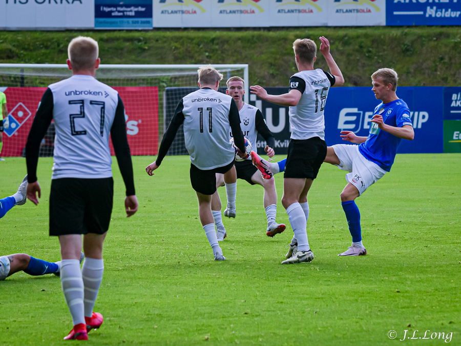 Kjartan Kári tekur svo spyrnuna en það verður ekkert úr henni.