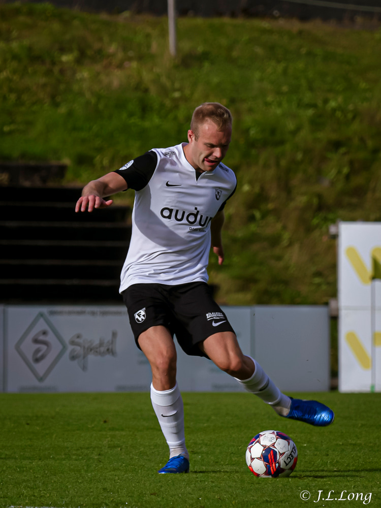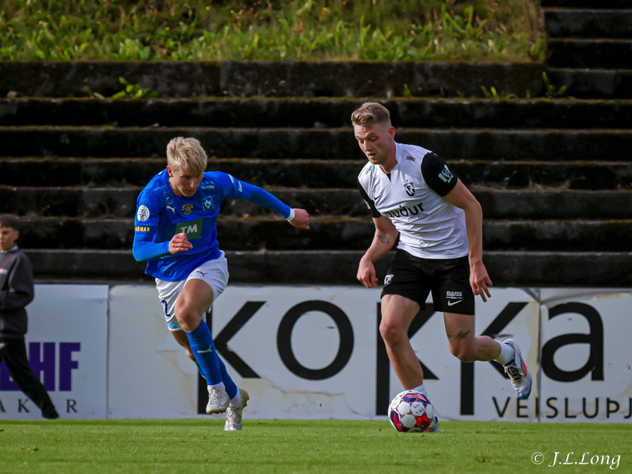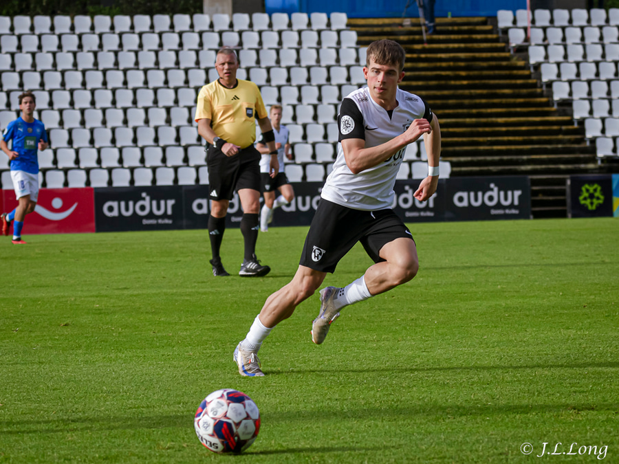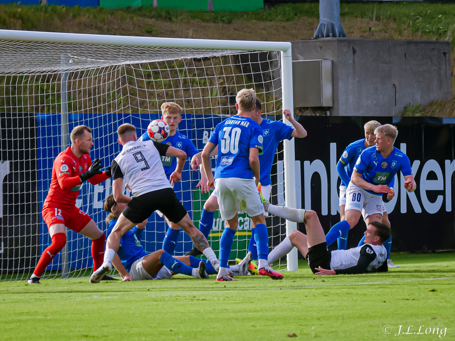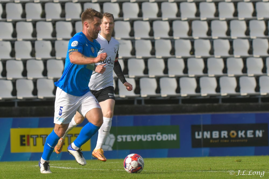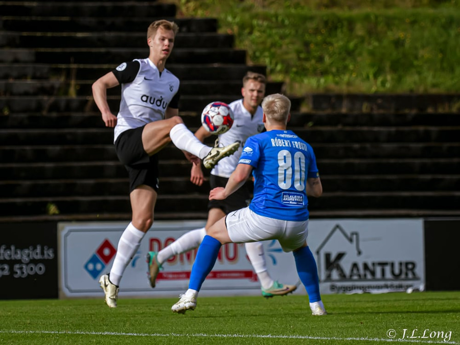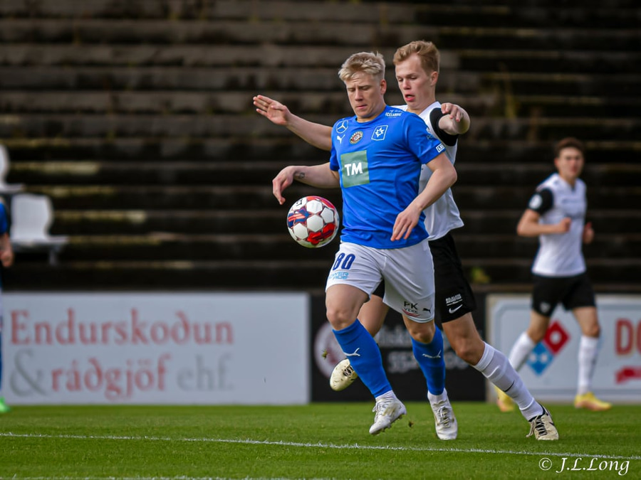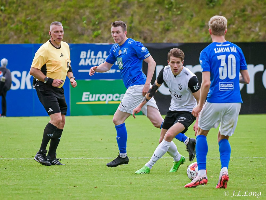 Kjartan Kári tekur svo spyrnuna en það verður ekkert úr henni.