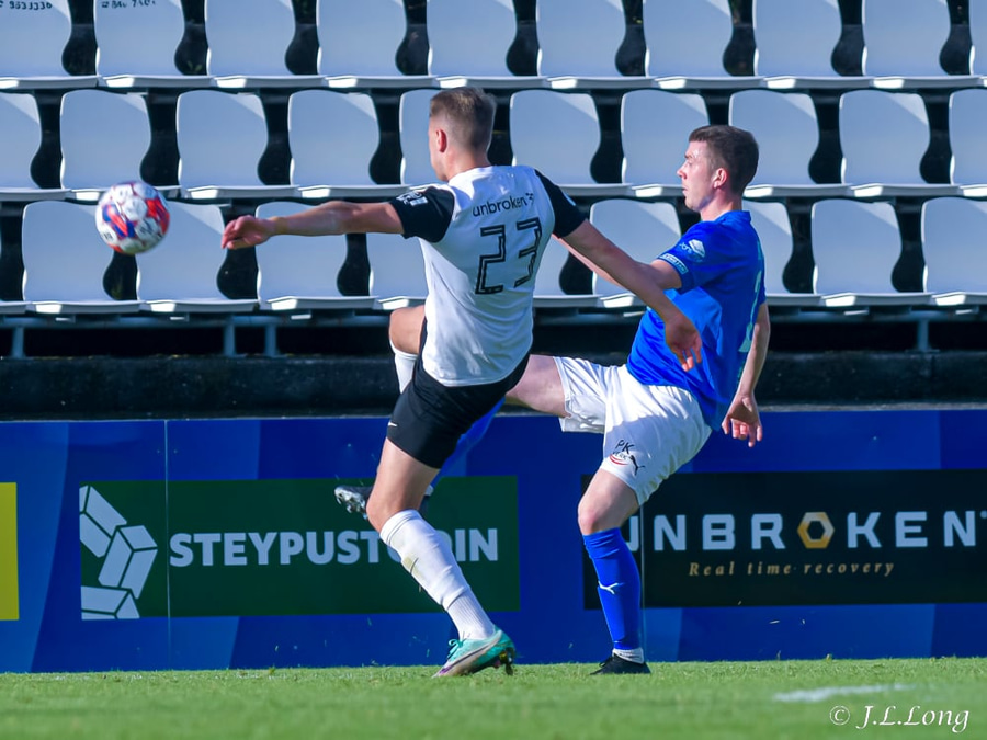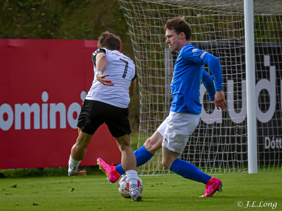 Ólafur Guðmunds dansar aðeins á línunni þegar hann ýtir Guðmundi Baldvin af boltanum. Guðmundur var að elta uppi bolta sem að ef hann hefði komist í hefði hann verið einn gegn markmanni.