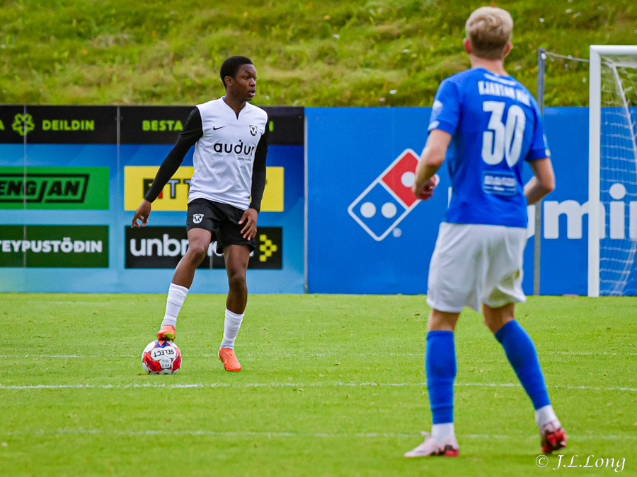 Þá er það komið að Ísaki Óla að vera með glæpsamlega sendingu úr vörninni, beint á Guðmund. Guðmundur tekur bara nokkur skref fram á við með boltan og þrumar boltanum upp í skeytin.
