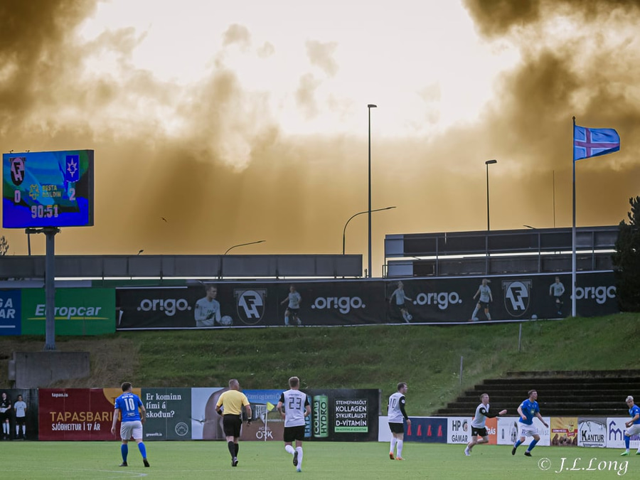 FH tekur hornspyrnu og Ísak Óli og Örvar Logi hlaupa á móti hvor öðrum, hoppa upp til að fara í skallaboltan, en skalla hvorannan. Þeir liggja þá í grasinu og á meðan fellur Böðvar við eftir einhver viðskipti við Gumma Kri. Þá byrja menn að kítast og hitinn kominn að suðupunkti.